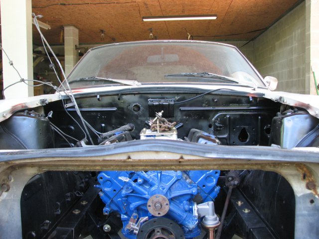 So I guess I'll use this as my build thread FTM. I'll start one in the member's section at some point... A lot of things have happened since this last post...moved from base housing to a nice house outside the gate with tons of room to work on the car. Changes since this last post: -Cut the cross-member in half and used a sleeve in the center--much easier -picked up a set of the Patriot block huggers--fit great, but I need to "clearance" the driver's side for the steering shaft (where's that pencil torch and sledge at?) -finally drilled the mounts and x-member and the motor has sat in the car under it's own weight...yay! Still need some hardware (bolts aren't quite long enough) before I can put it in for good....i can see the light--pinprick, but it's there. I'm going to bolt the tranny up tomorrow and put everything back in (lost count of how many times so far) so that I can put the JTR mount in place. Then I'll take it all back out so I can put the clutch, etc. in and then back in it will go. I'm stoked that it's almost ready to be put in for good. Still have a lot to do inside the car, on the engine and basic maintenance before any rubber is burned. Here's some pics of the motor in tonight. It's tilted towards the rear a little much due to no tranny. Damper and front sump have plenty of clearance when the motor is tilted forward in the "normal" position.