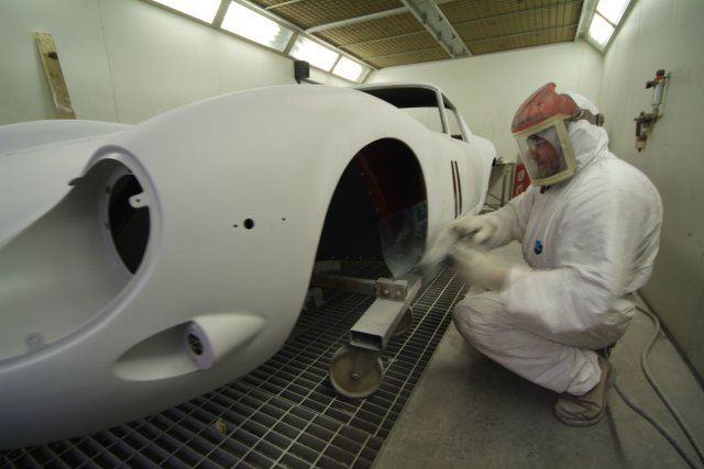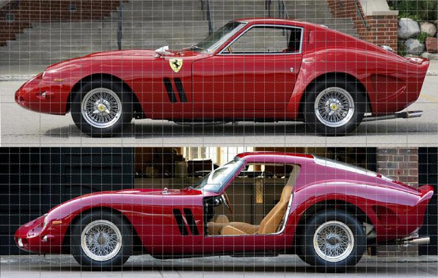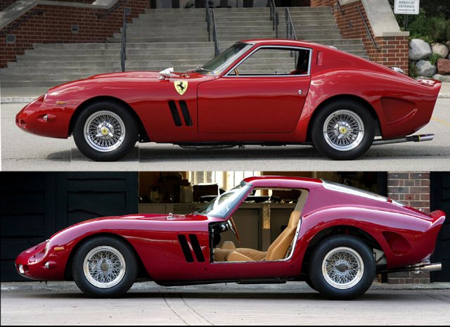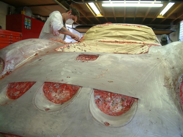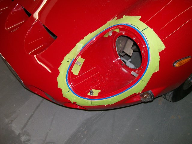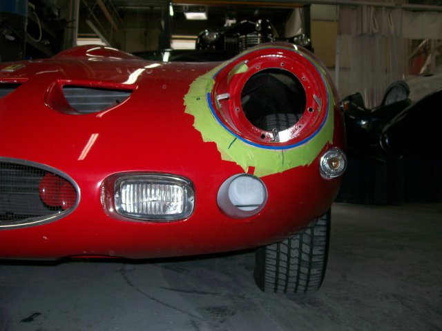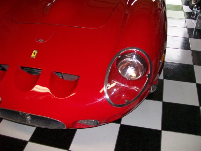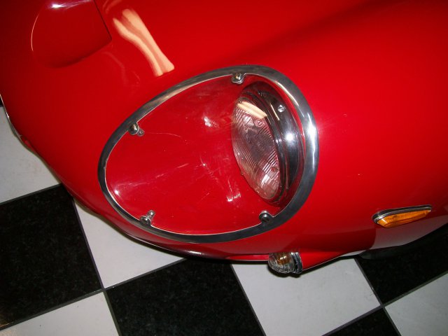 okay, sorry for slow reply.. the scoops on our red car are not like an Alpha, on the Alpha for some reason they really made it a coumpound curve, almost like a bowl. It could be for improved airflow, or the original was formed using pics that didn't show it clear or simply artistic license, i honestly don't know.. On ours they are closer to the original, but still not exact.. that's a nice thing about the original GTO's, they were all slightly different.. some had additional scoops, different driving lights, hood bulge shapes, etc.. I even have some pics of one with little bumpers so there's always some wiggle room mkaing a replica 250GTO unless you are trying to match one specific car. Or air intakes in front of the hood are 7.25" wide and 6.5" front to back, and they are on 9 7/8th" centers leaving about 2 5/8" of material between each scoop. To make them just use 3 simple cylinders secured in place. I used plastic paint mixing containers as they were thick and sturdy enough to hold their shape, and the resin wouldn't attack them. Once I built up the panel and the glass had cured I was able to pop the "forms" right out and cut away excess to get the look. I attached some pics of the nose as i was modifying it as well as an original Alpha1 nose and then some close up pics of some original GTO noses to see the angle to cut away the intakes and placement of the Dzus fittings. Last pic is of an unusual original GTO as it was seen at one point.. i can't remember which ca it is, but i do recall during a restoration it was changed to how the scoops look on most of the others