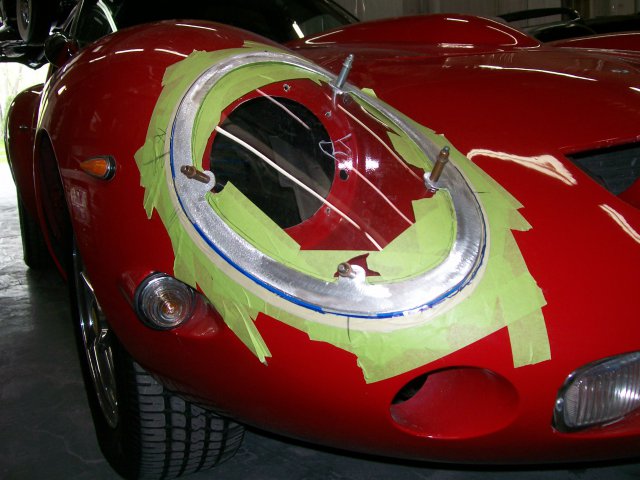 Okay, and here's some pics of our red car's covers. We used brackets carved from billet and then polished. The trim rings were cut from .060 aluminum then filed to shape and polished and we used large flat slotted screws to hold them on. The brackets were attached by drilling holes through the body with bolts all the way through. Unfortunately not using a metal front end with tabs means you have to slightly shift the location of the inside rear brackets as there's no way to drill the mounting hole through the nose to perfectly match original. Honestly i don't see that as a problem though as our headlight buckets really are shaped different than original. Here's our solution... brackets aren't really noticable and it's a subtle enough difference i think to not be a concern Chelle