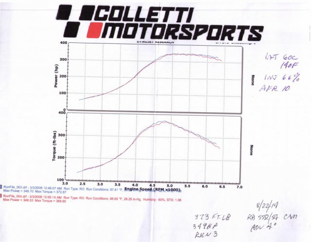It all started with a cam regrind from Schneider, the Racer Brown SS56/54 turbo grind. They took 2 months. When reinstalling, had to turn up idle screw 2 turns and only got 10" Hg vac at idle. Used to get 12-13". On the Dynojet 248H t got 325RWHP at 18 psi boost. Used to be 410. Ran cam straight up as before. Degreed cam to be sure. Just checked Intake open event which matched cam card. Tried adv cam 6 deg, but just reduced top end range. HP curve flattens out at 5k to 6K RPM and does not even equal peak torque. Motor leak down is 2-4%. Tried another milder RB regrind from Schneider the SS54/52 which always had about the same top end power before and exceeded the hipo cam power to 350 RWHP. The idle vacuum was 12 inHg, much smoother. I've missed the whole Summer with this regrind issue. I did send the original RB cam, which Schneider refused to regrind because they claimed the metalurgy was compromised. It had 0.030" pitting on the #6 cyl lobe nose. I just got it back from Delta. Will install and compare. Extensive datalogging history substantiates the big disparity of over 80 HP. For example the fuel flow and AFR figures show the regrind cam motor is pumping less air. Inj duty is high 60% vs high 70%. Did change to Z32 tranny and CV joints in rear axles, but this can't equate to overall loss. Meanwhile, thoughts and experiences anyone?+