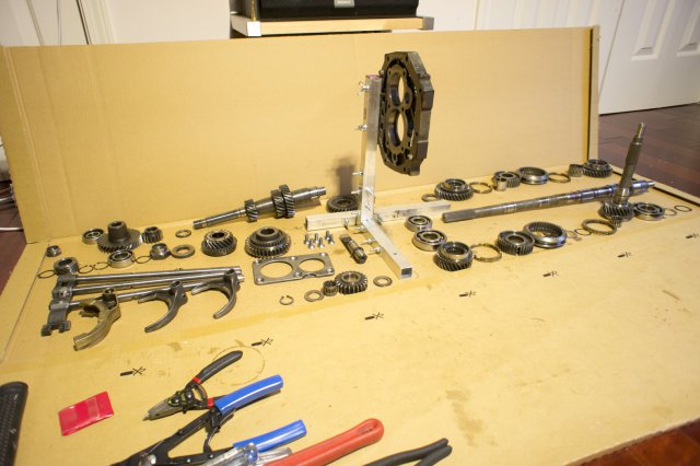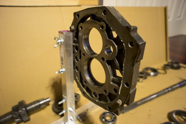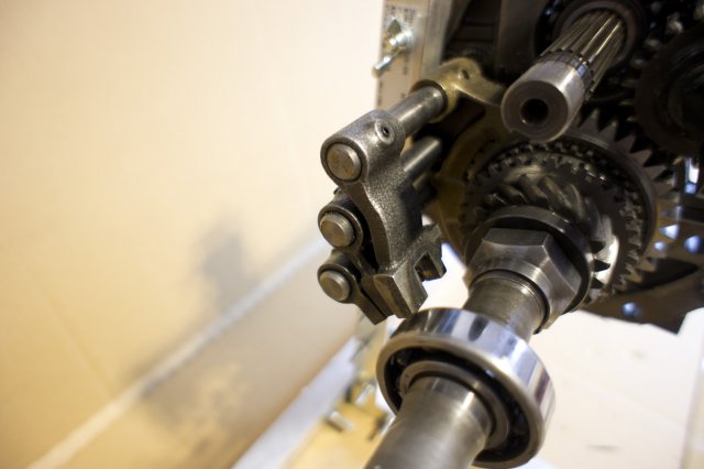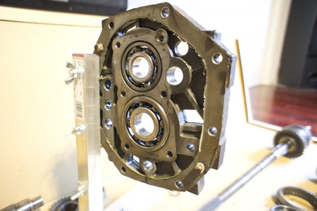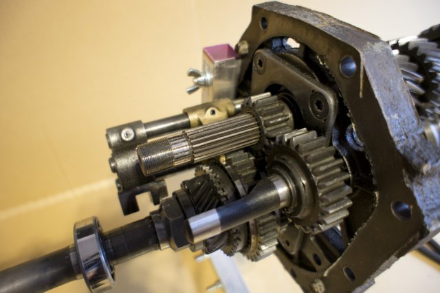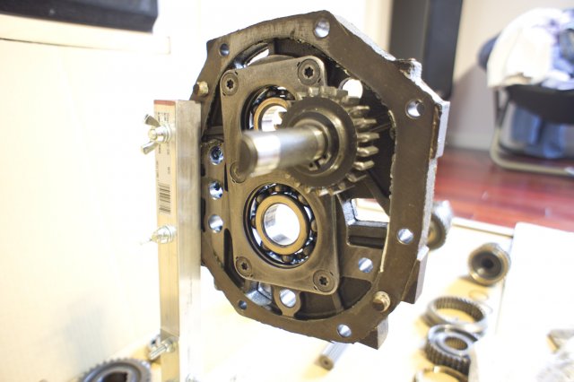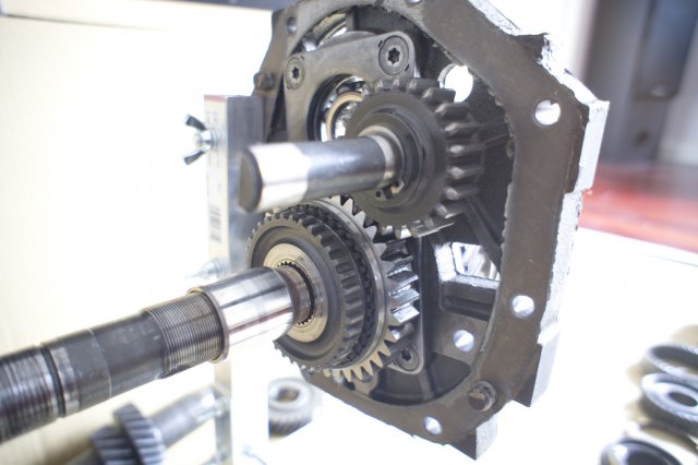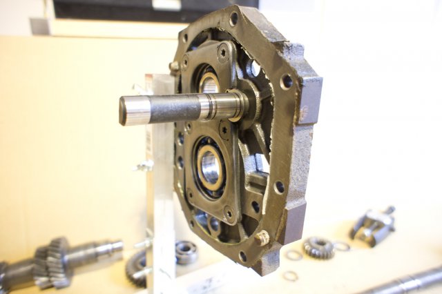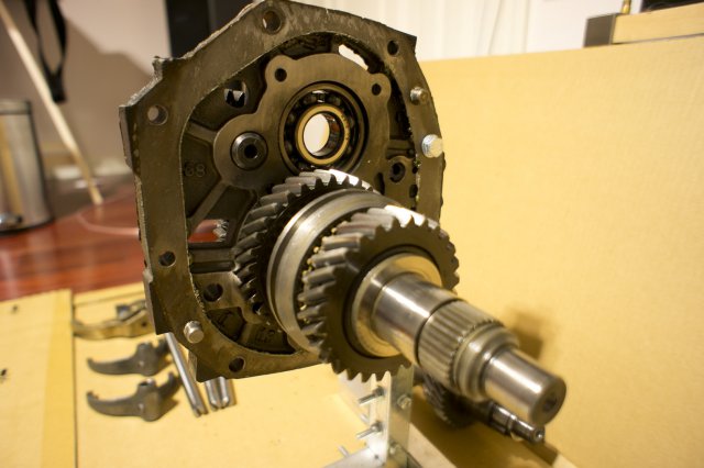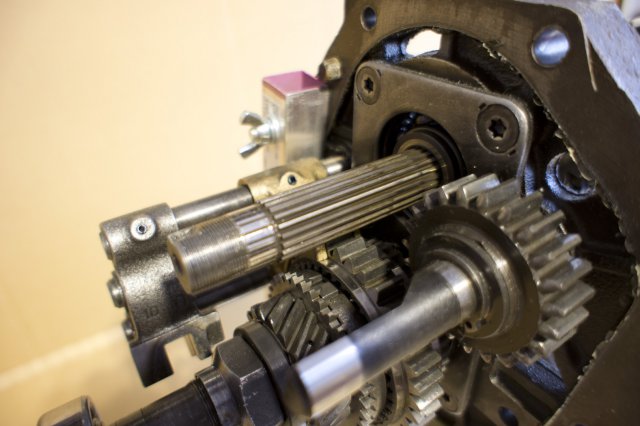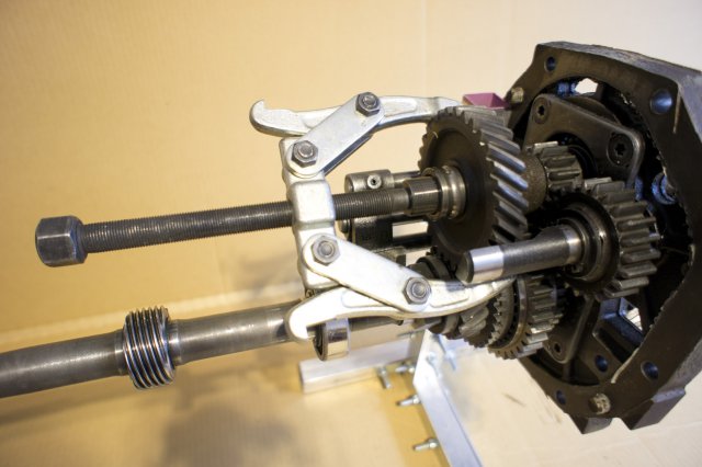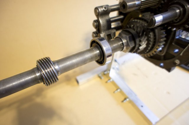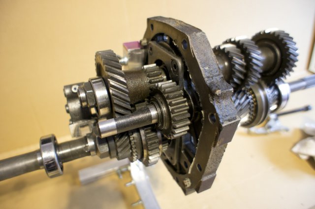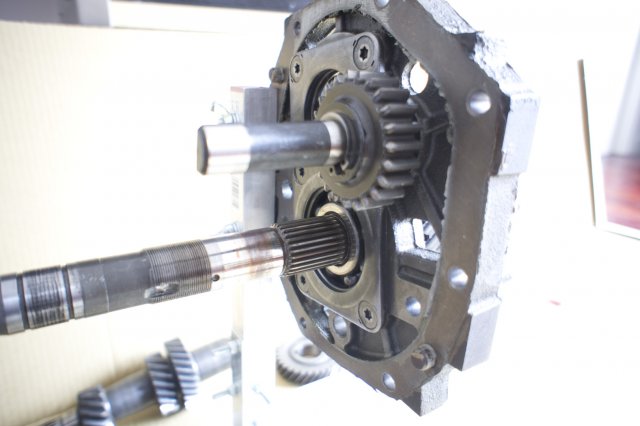 Main drive gear removed. (Countershaft drive gear needs to be removed first. It is still attached in the picture because there was so much play from bad bearings that the main drive gear fell out while pulling the countershaft drive gear out).