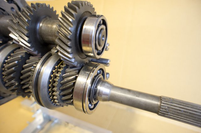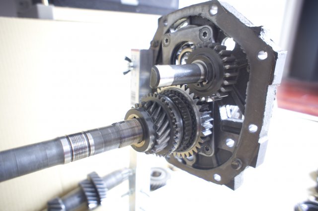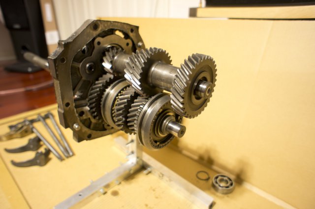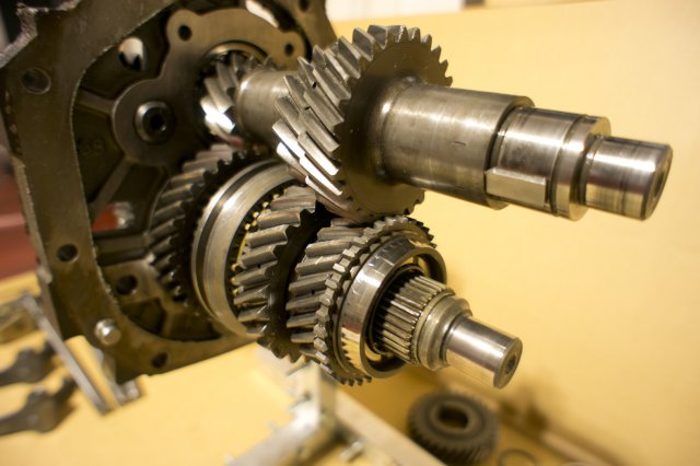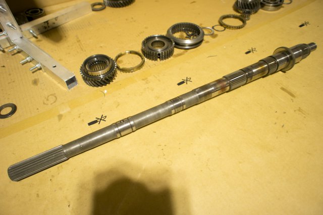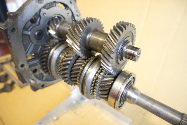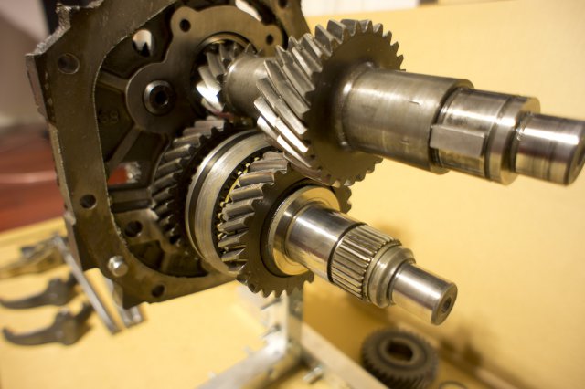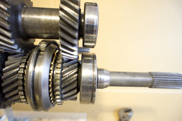 Countershaft drive gear removed. Baulk rings, synchronizer hub, and coupling sleeve, removed.