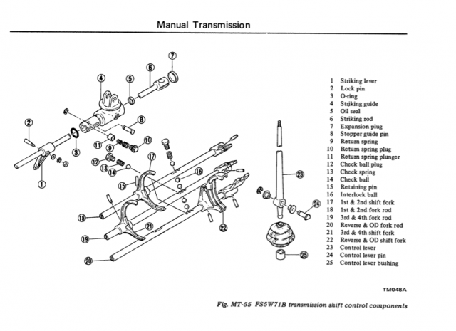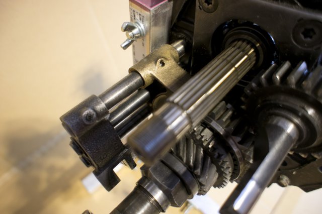 Retaining pin removed from reverse/overdrive shift fork (bronze color piece).