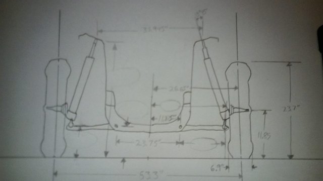 I'm in the process of making a 1/2 scale model of the front suspension of a stock S30. I got most of the measurements I need from the chassis diagrams that are still floating around the internet, luckily, but there's still quite a few I need. I have a crude drawing, I don't have a scanner so I used my computer's camera and flashlight to get the sharpest image I could. You can see what I have and don't have (I hope), based on a 175/70/14 tire. My car was so far gone in the beginning that I couldn't take measurements if I needed too, now there's nothing left of the factory set-up...so I hoping you all can help. I can still get the length of the lower control arm so don't worry about that one, I still have my arms lying around. So if you have a bone stock 240Z, with the 175/70/14 tires, unaltered ride height, and the time, will, and means to get me a couple numbers, it would be greatly appreciated. I'm going to design my own later on, but I want to have a factory model to compare it to and see how it behaves in bump, rebound, and roll. Of course when it's done I will post photos and everything here so everybody can learn from it.