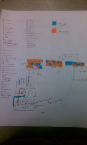 Okay, now lets see if i have this figured out properly now... Here is a diagram that i just made and I do apoligize about the clarity of the picture.i dont have a scanner,so I could only take a picture. The diagram is of a pinout from the ecu to what is nessecary to make the car run properly I hope.if you can't really see the licture too well,please refer to the wiring diagram for the ECCS that I posted as well. The blue highlighted areas are the pins that I believe I do not need(I have a non egr intake without an air regulator) The orange highlighted areas are the pins that i do need. I broke most of the orange ones down that I need to specifically hard wire in,some of it may be questionable because my harness was previously hacked up before. I do not have a fuel pump relay, and the efi relay wires were cut previous to me getting the harness. The other "+" coil wire is my original tach wire so that would go to the "+" coil side, correct? Now with everything accounted for, please review the diagrams andet me know if there is anything I listed that is wrong, or you are uncertain about. Also, I would like to put qll of my ground wires directly to the "-" post on the battery because I would like to try to avoid any bad grounding issues. Would that be acceptable and work properly? -
