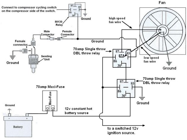 Guys, I just received the attached .jpg from Painless with their additions to my basic circuit design. Now I'm confident that it will work as planned. They sell everything needed except the 2-pole 70 amp (5-pin) relay (1 reqd.) that you can get from NAPA (my plug for Painless Performance based on all the help they provided), but you can also source these components at your favorite shop. We decided not to include the continue-cool-after-ignition-off circuit since this fan uses most of 70 amps on high, it would drain a battery pretty quickly. Also keep in mind that your alternator has to be up to the task of running this fan with lights, AC, radio, etc. on at the same time unders normal circumstances. I have to thank Dennis Diehl and his boss Dennis Overholser at Painless for their time contributions to this circuit design. Since JTR recommends this fan, I hope a number of guys on this forum find it useful. I know I will. Thanks, Steve