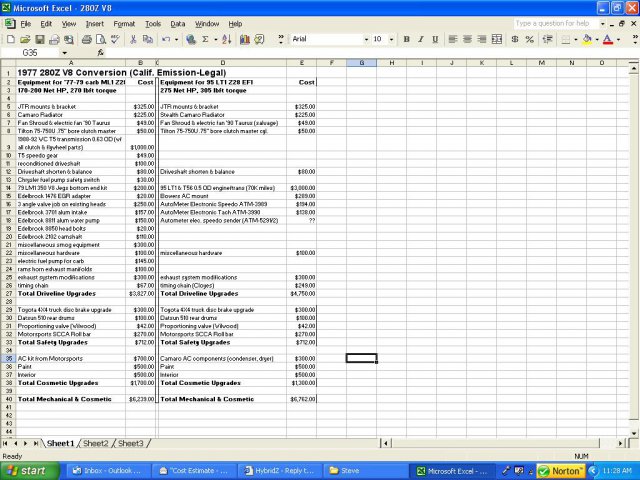 Guys, The last one was almost readable. Unfortunately, I keep exceeding the file size limts of the site. So I just copied it into the body of this message. I hope you can read it now. Steve 1977 280Z V8 Conversion (Calif. Emission-Legal) Equipment for '77-79 carb ML1 Z28 Cost Equipment for 95 LT1 Z28 EFI Cost 170-200 Net HP, 270 lbft torque 275 Net HP, 305 lbft torque JTR mounts & bracket $325.00 JTR mounts & bracket $325.00 Camaro Radiator $225.00 Stealth Camaro Radiator $225.00 Fan Shroud & electric fan '90 Taurus $49.00 Fan Shroud & electric fan '90 Taurus (salvage) $49.00 Tilton 75-750U .75" bore clutch master $50.00 Tilton 75-750U .75" bore clutch master cyl. $50.00 1988-92 WC T5 transmission 0.63 OD (w/ all clutch & flywheel parts) $1,000.00 T5 speedo gear $49.00 reconditioned driveshaft $100.00 Driveshaft shorten & balance $80.00 Driveshaft shorten & balance $80.00 Chrysler fuel pump safety switch $30.00 79 LM1 350 V8 Jegs bottom end kit $200.00 95 LT1 & T56 0.5 OD engine/trans (70K miles) $3,000.00 Edelbrock 1476 EGR adapter $20.00 Bowers AC mount $289.00 3 angle valve job on existing heads $250.00 AutoMeter Electronic Speedo ATM-3989 $194.00 Edelbrock 3701 alum intake $157.00 AutoMeter Electronic Tach ATM-3990 $138.00 Edelbrock 8811 alum water pump $150.00 Autometer elec. speedo sender (ATM-5291/2) ?? Edelbrock 8850 head bolts $20.00 Edelbrock 2102 camshaft $110.00 miscellaneous smog equipment $300.00 miscellaneous hardware $100.00 miscellaneous hardware $100.00 electric fuel pump for carb $145.00 rams horn exhaust manifolds $100.00 exhaust system modifications $300.00 exhaust system modifications $300.00 timing chain $67.00 timing chain (Cloyes) $249.00 Total Driveline Upgrades $3,827.00 Total Driveline Upgrades $4,750.00 Toyota 4X4 truck disc brake upgrade $300.00 Toyota 4X4 truck disc brake upgrade $300.00 Datsun 510 rear drums $100.00 Datsun 510 rear drums $100.00 Proportioning valve (Wilwood) $42.00 Proportioning valve (Wilwood) $42.00 Motorsports SCCA Roll bar $270.00 Motorsports SCCA Roll bar $270.00 Total Safety Upgrades $712.00 Total Safety Upgrades $712.00 AC kit from Motorsports $700.00 Camaro AC components (condenser, dryer) $300.00 Paint $500.00 Paint $500.00 Interior $500.00 Interior $500.00 Total Cosmetic Upgrades $1,700.00 Total Cosmetic Upgrades $1,300.00 Total Mechanical & Cosmetic $6,239.00 Total Mechanical & Cosmetic $6,762.00 -