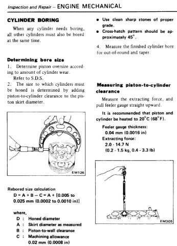 Thanks for your answer I'm back home, my first move was to check "how to rebuild your Datsun OHC Engine". Page 66, I can read: So with my 0.080 mm, I'm right where I should be However, I've surfed over the Internet to see what should be piston-to-bore clearance on other engines. Most of them are more around 0.0015 max. Ok, it is not a Datsun engine but the recommended clearance is most of the time below my measurements. So back to Datsun Service Manual, here's a copy. It is not in accordance to what the book mentioned above is stating. Is there something I don't understand I'm still confused - but I start to feel better!
