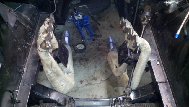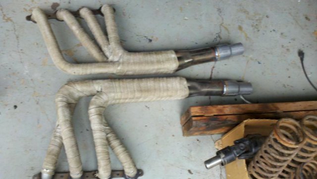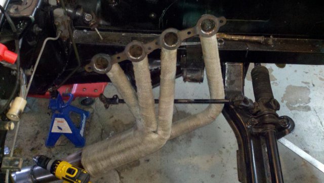 My wrapping job is ugly enough to be a modern art masterpiece but it's all done but the itching (fiberglass). It's definetly a tight fit and I may have contact at the subframe on the passengers side, I had about a quarter inch before wrapping. It took me about an hour to put in 8 motor mount bolts and I'm pretty sure I can get the starter in. I still need to figure out what kind of exhaust flange to weld on to the collector reducer but I should be able to do that with the headers installed and I also forgot to layout the O2 bungs while I was building them so that will be another under the car weld. I'm probably around 25 hours and $300 for these.