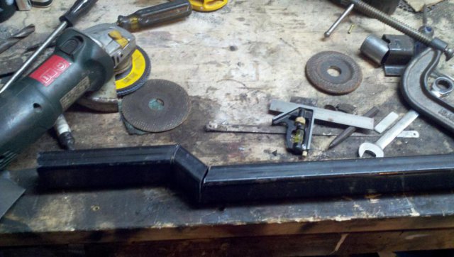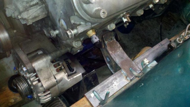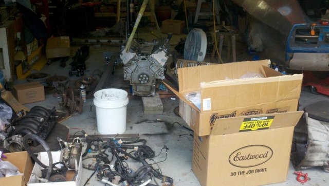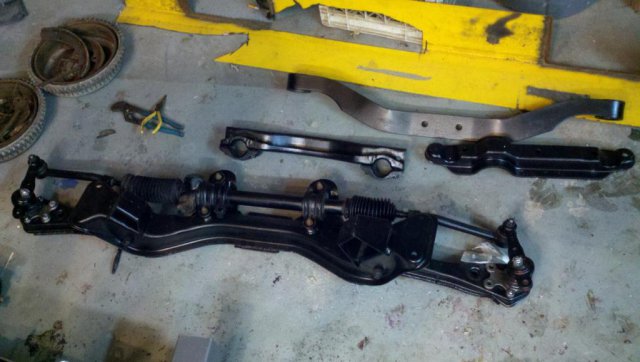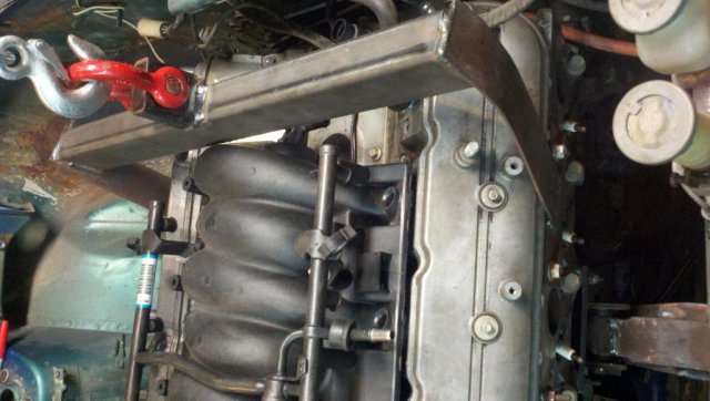 Finally got back home from Georgia and got started. Started with the front suspension, painting and replacing worn/damaged parts and installing Toyota calipers and repacked the bearings. There is a mess 'o stuff in my garage I wanted to get my suspension back in so I could move the car a little to help have more clearance for the engine hoist so I started on the HLSD. I took my open diff to a trans shop to see if they could pull the bearings without damaging them, they gave it half a try and told me they couldn't do it with out damaging the cages, so off to Harbor Fright for a bearing puller. I got the passengers side of with no problem and started on the drivers side, it started off so to I ran the OBX unit inside to put in the freezer to try to help with reinstallation. The puller must have slipped and damaged the cage when I was away. New bearings ordered, 5 days out. I neglected to get the clutch bleeder from speedway so I just bolted the engine and trans together. I'm going to have to pull the engine after any way to clean up the heads and install the cam so the engine will be on a stand Installed the front crossmember and built a lifting bar for the engine and transmission. The lifting bar worked out pretty well, turned one way it hung the engine and trans at a good angle to slip into the bay and then turned 180 degrees it lifted it level. Placed the engine/trans in the car and spent a fair amount of time aligning the engine to the diff, I had string lines, levels,. I used the old trans mount from the Datsun, cutting it in half and boxing it in with 2 X 1/8" flat. I got started on the trans crossmember and should finish that today. I'll have to throw the shifter and drivers seat it and make some engine noises and bang out some speed shifts. I think I may have a cracked oil pan, will pull it and check it and weld it up at work tomorrow if needed.