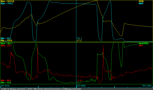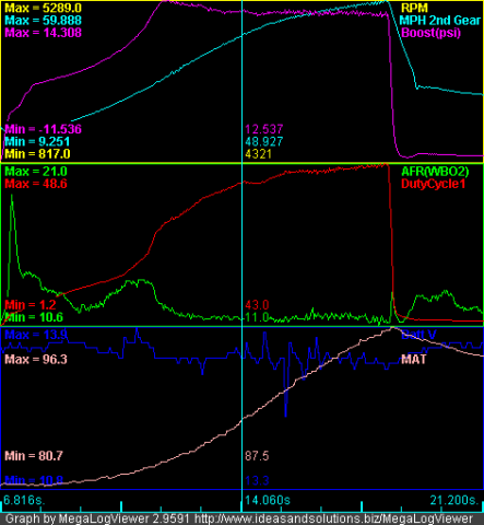 It feels like it might be misfiring, and sometimes it seems to run poorly after a WOT pull, you can smell unburnt fuel when it does run poorly. The odd thing is that it doesn't seem to show up on the wideband trace. It doesn't do this unless you go past 4500-4600, if you stay below, it runs fantastic. This feels like a large unnatural power loss, not like the engine just running out of steam. The thing that really bothers me the most, why does the power just disappear but the datalog looks perfect? I have datalogs of it breaking up at 4500, then continuing to run like crap for 30 seconds more, the afr's on the log look fine, the only telltale sign is that it took more throttle to keep the car going than normal. Spark advance is around 40 degrees in the low load cruise areas, at 12psi it's closer to 20. Megasquirt is controlling spark, it's set up firing the coil directly. I didn't put the head together, so I'll check and make sure the springs are all there. Could a set of worn or poorly maintained hydraulic lifters/lash adjusters cause odd problems like this? Compare this to the 1st pic, notice that it doesn't fall off. This one went to 5500 easily.