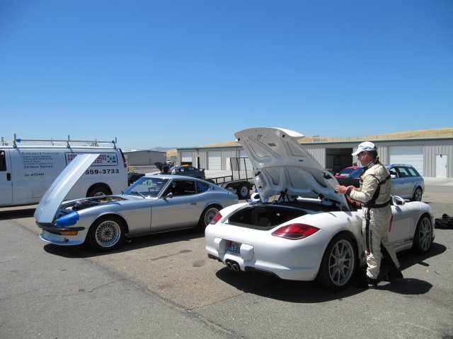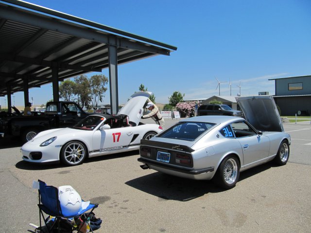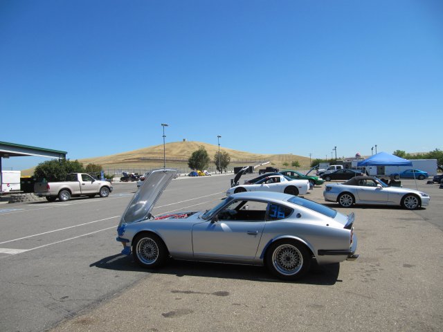 I got to take the Z to the track in spring 2010. Drove the car to Thunder Hill as a last minute deal (got the OK from my wife the night before). So I just got in the car in the morning and drove. I did not get a chance to put on sticky rubber or anything. The Z was amazing. It handled perfectly. I drove the car as is, I did not remove weight (amplifiers, sub woofers, passenger seat) the tires were Bridgestone G009 a high performance A/S tire. It handled almost flawlessly. When driven at 80% there were no issues. When pushed to 100% I found a limitation with the brakes. At the end of three laps at 100% on the back straight I was out accelerating a Corvette Z06 405 hp version and my brakes faded. No issue occurred but I found out something about the car. When I purchased the brakes from MSA I asked if the brake pads were a performance pad and I was told yes they are. After this event I called MSA and asked again if the pads are a performance pad (so I would have an idea of what to purchase as an up grade), and I was told no. They are a standard Toyota pad. So I will be up grading the pads. It was great to see how an old Z compared to the modern cars. I was there by myself so I did not get any action shots but here are some in the paddock.