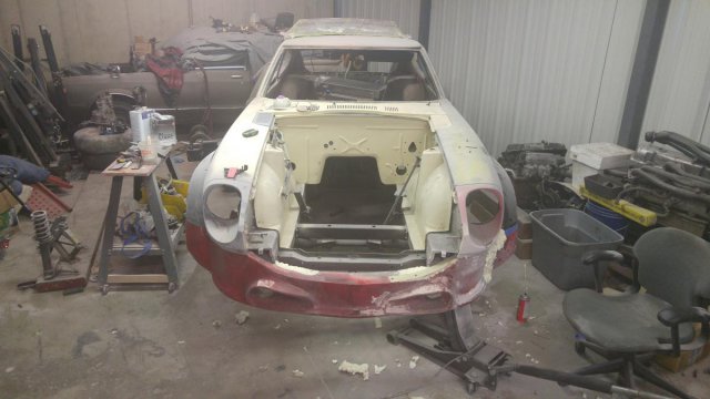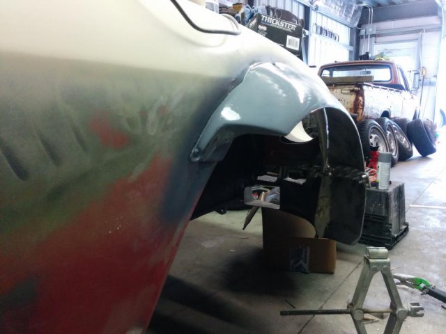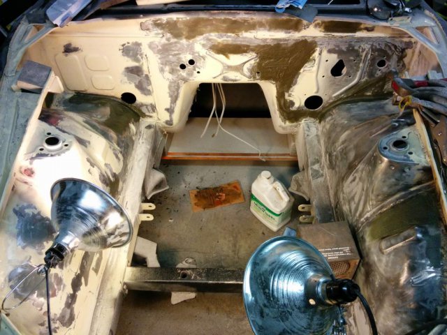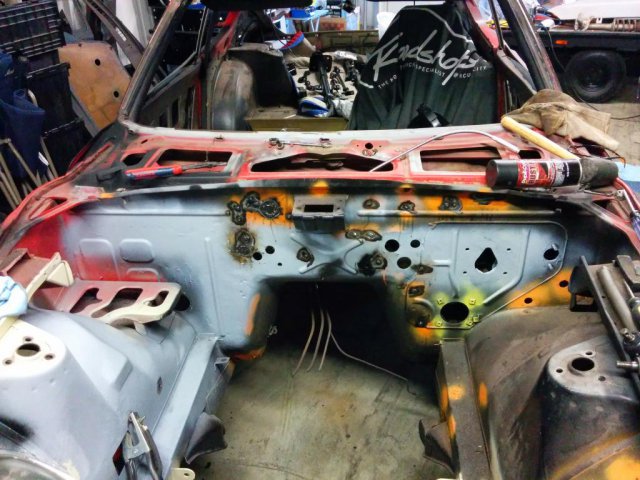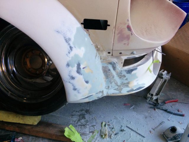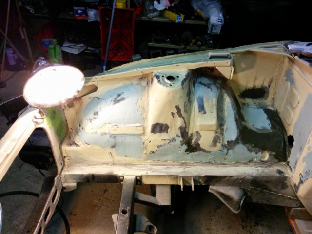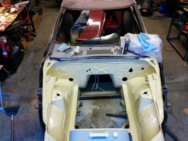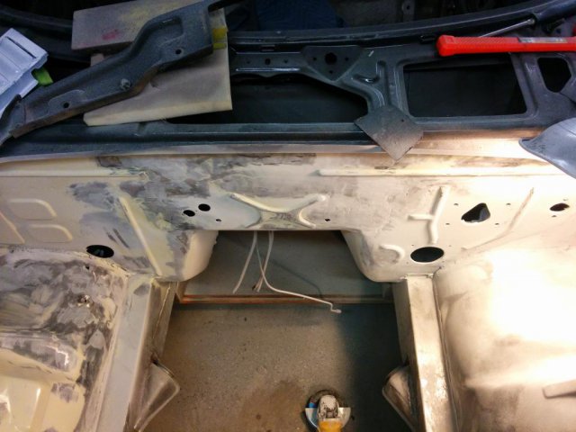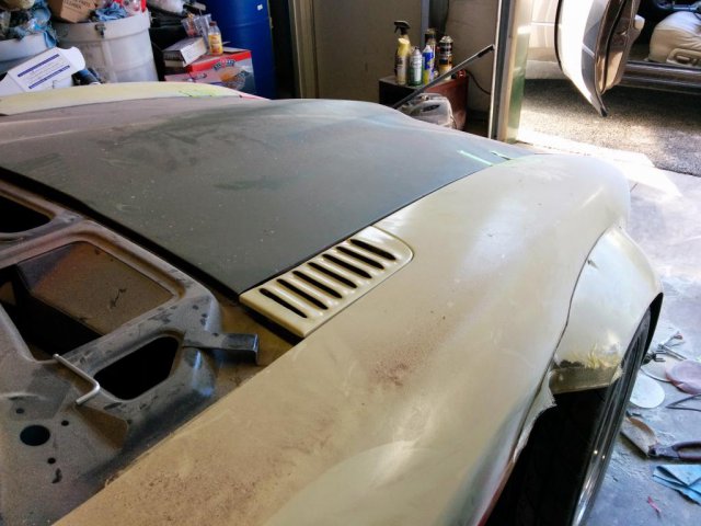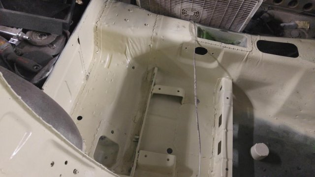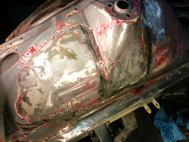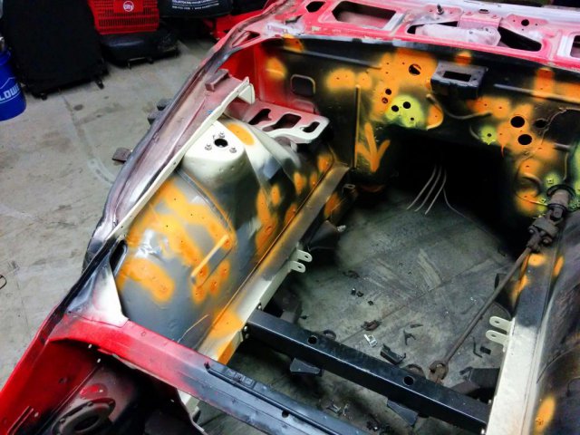 One of the first things I tackled was shaving all the unneeded holes in the engine bay and on the body. The areas I marked in orange were all the spots requiring attention. The rest of the pictures show the progression of the smoothing/shaving. -