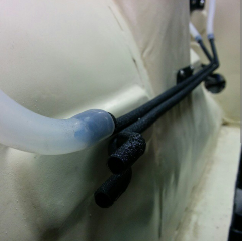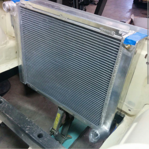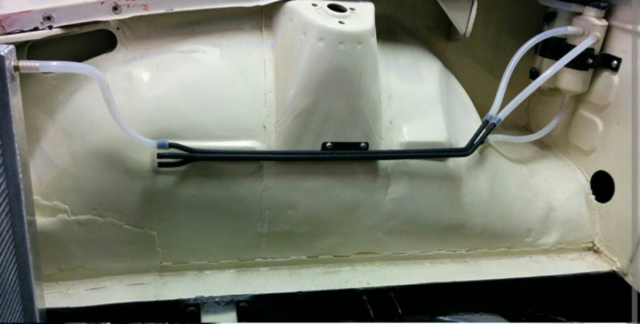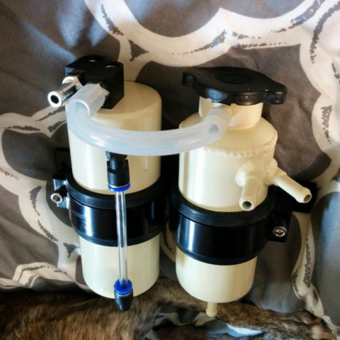 For the cooling system, I have a 24x19x3" "GM" style sprint car radiator that I cut the cap/neck off of and added a steam port. My intercooler (not pictured) is a 24x12x3" tube fin deal. More on this later. I made up some steel headlines for the steam vent and upper and lower water necks to connect to my swirl tank and used 4mm wall thickness silicone tubing. My coolant swirl tank is a basic Parts Shop Max clone. The overflow is a modded "oil catch can" from eBay. I added an internal pickup tube to the line that connects to the swirl tank, so it's a fully recirculated setup. The bracket was made for a twin Bosch 044 fuel pump setup, but since I do way too much research, I realized that both my catch tank and swirl tank would fit with minimal mods. -