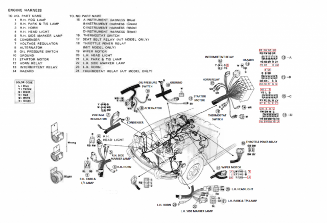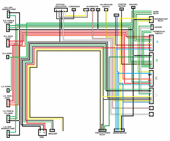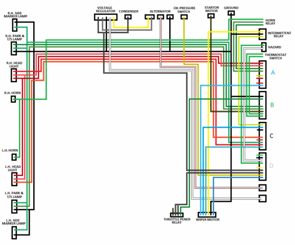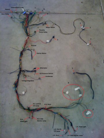 I have completed about 85 to 90 % of the wiring diagram for a “1973†body harness. I can’t complete the rest because I have 9 unknown wires that I don’t know where they go. There are 3 wires from the blue Connector A (yellow/green, red/black, and red), 2 wires from the black Connector C (black and red/blue), 3 wires from the white Connector D (green/white, black, and yellow/white), and 1 wire from the Throttle Pener Relay (black/yellow).