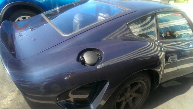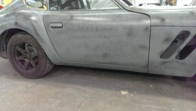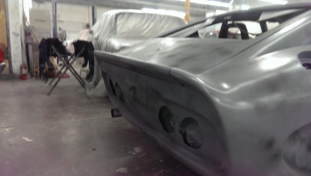 I've made a couple trips to check progress. The first was not picture worthy but today's was. I am still a week away from picking it up, and I suspect I will need at least one more visit to check the small parts to confirm all the polished bits get painted black. I asked them to build up the rockers to blend the tub, door skins and the cheek panels, which I think they nailed: I went over the spoiler and tub looking for seams and uneven transitions, and was pleased I could not tell where metal meet glass... -