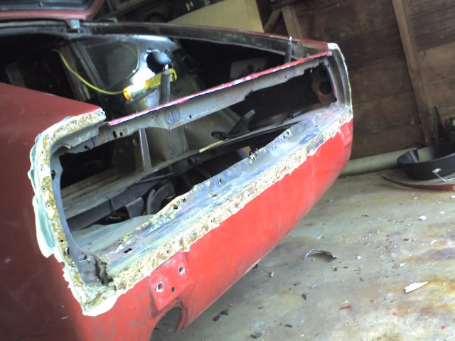 I tore off the very hacked tail light housing this weekend. It turned out worse than I had imagined. A strip of aluminum had been riveted around the stock steel, then covered over with bondo. The problem is that he didn't seal the inside and every one of the rivet holes started to rust. I took as good a picture as I could to show what I mean. I'm definitely taking suggestions for tail lights. -