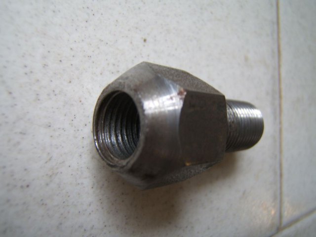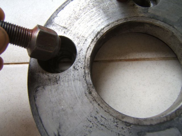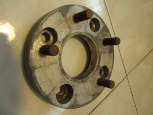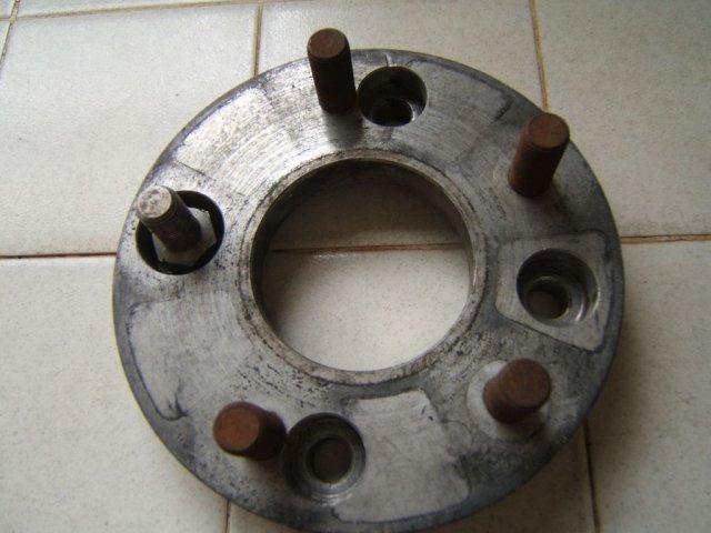 Several people have PMed me for more information about the spacers and therefore I would like to add more pictures here so everyone can see the design of this type of spacers. I was incorrect about the longer stud in the previous post--my memory has been fading laterly . The actual stud is a custom-stud with threads on the stud head. Once this stud is installed (one for each spacer), regular wheel lugs can be used. Beside this stud, each spacer is held onto the hub by three nuts. One issue that I observe with this type of spacer is the close proximity between two of the original studs and the spacer' studs. For everything to fit flushed, the holes for the three nuts mentioned above need to be relatively large; and these larger holes are very close to the spacer' studs. Cracks could be seen in this area--not all the way, but around the enlarged part of the nut holes and the studs. Hope this information helps in your search for a 4-to-5 lug spacers.