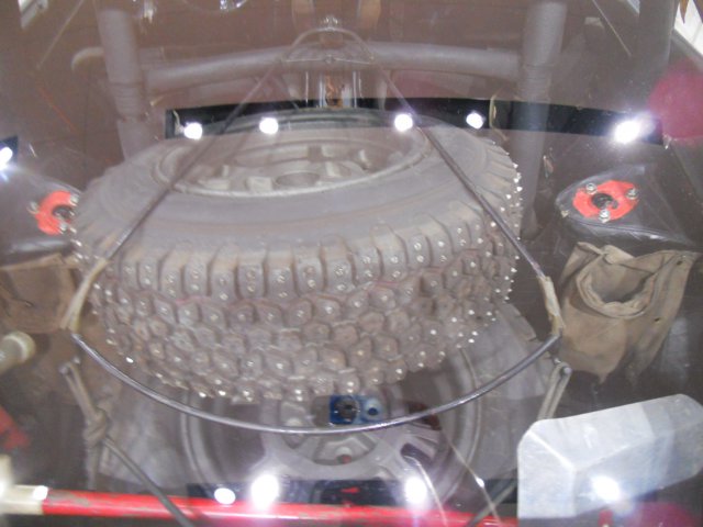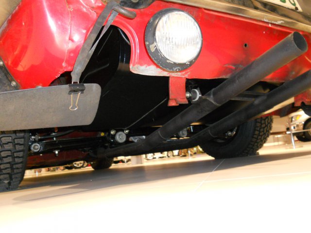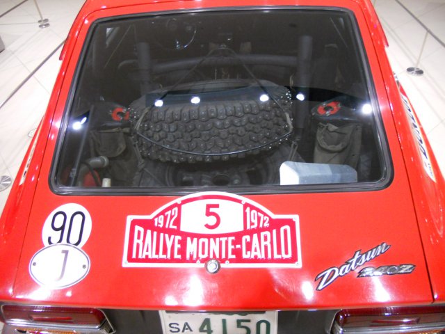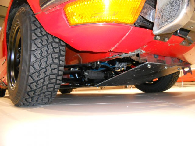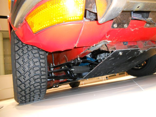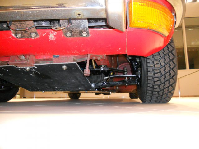 Current tires on the car displayed at Zama (#5) and loaned to Nissan Dealers through Japan are Dunlop SP Sport-85R 185-65-14 "For Rally Use Only" directional tires (marked "Outside" and "Inside" on the sidewall)--THESE ARE DIFFERENT THAN THE STUDDED TIRES IN THE BAGGAGE COMPARTMENT, but comparably-sized. This is a cross-section of the 'under photos' I took in Lo-Res. They can come on fairly unimpeded. The high res stuff is more in detail of little bits about the car, but from these you can see they have 'dropped' the car for display--look at the droop in the tie-rods, definitely set up for a higher spring rate to lift the car than what is on there now. In these photos you can see the damage from rubbing tyres, and ripped unit-body parts from things being torn off the car at some time. You would be surprised to know how well a stock Z does off-road just stock. Lift the suspension by rewelding the perches an inch or two higher and using higher rate springs to prevent bottoming so easily and get some suspension travel dialed in and you are set with a pretty much stock car. For what you propose, your main concern will be lifting it some to prevent bottoming and protecting undercarrige from damage scraping over crap. Have a look at these photos (see their spares: two tires, a shovel, a long-travel jack, and stuff bungeed in bags all over inside the car!) and see if you get any ideas. This one doesn't need to break the bank. Remember this was a full-on-at-speed competition car. If they did it with this, there's no reason you can't as well!