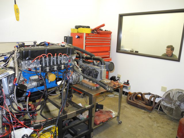 3. At long last more to report. The 'loop the hose when the heater is bypassed' was finally tested today. Long and short of the testing was that with the back of the head looped straight to the pump inlet (like some do when bypassing the heater core---instead of blocking it off)the following results were obtained using the Nissan CHT as read through the Nissan ECU. With a 25hp load on the engine running 4500rpms and the hose looped and open, CHT=220F With a 25hp load on the engine running 4500rpms and the hose BLOCKED CLOSED, CHT=170F Results obtained on a Superflow 900 series Dyno, with the thermostatic water valve set to maintain 160F water. The tests were stopped at 4500rpms as the suction hose on the dyno would start collapsing above that point. This would be similar to stock gearing at 80+ mph or thereabouts. What we wanted to see was how high we could go before the 'open hose' started to rise in temperature, but even with a collapsed hose above 5000rpms we could not get CHT above 170, whereas with the hose open and flowing to the pump inlet (which you think would help prevent the hose collapsing...) the temperature started to rise even more above 4500, so we figured stopping the test there was the best comparison. Results at 3000rpms were almost identical when the engine was 'stabilized' --- that is run in steady-state load for several minutes. Yes, we were running the engine for several minutes at a time checking load points, etc. Let temperatures stabilize then run to a higher number. So nice not to have to stop and let everything cool down! Mmmmmm, engine dyno! Gaaarrrrggggh! Later the engine was put through...uh..."More Rigorous Testing" Wallpaper, Anyone? Look, you can see Jeff almost looking happy! And the 'clamping device' to stop the flow in the hose. So much for the commentary earlier in the thread, huh?