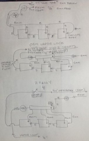The fuel cooler could be in the feed line coming up to the engine bay, and then one on each return. Return from the engine bay is hot, no matter what. I like to open loop the tank, and use the vapor line as it has far more flow capacity than the stock return. I also tended to use EFI pumps that flow like crazy so the two return circuits at 3.5 psi is not a big issue.