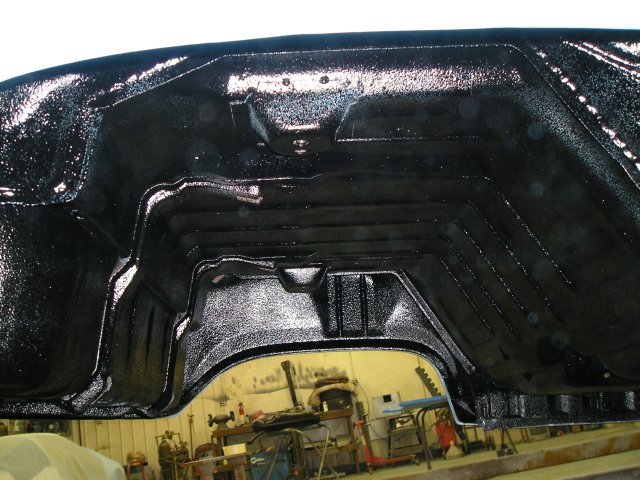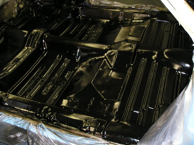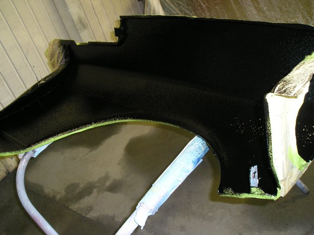 The stuff we use is SEM Rock-It tintable bedliner. It can also be purchased in black and in a kit with a free gun. http://sem.ws/Catalog.asp?prod=315A automotive paint suppy should be able to tint this to any car color if you don't want black. Ketone xylene is a solvent that works for us although it is not stated in the instructions, (Do not use thinners or reducers!) Mask off any mounting surfaces that may effect alignment of parts and remove masking before final cure or you may not get it off. They also make a tape with a wire in it but I have never used it.