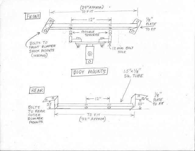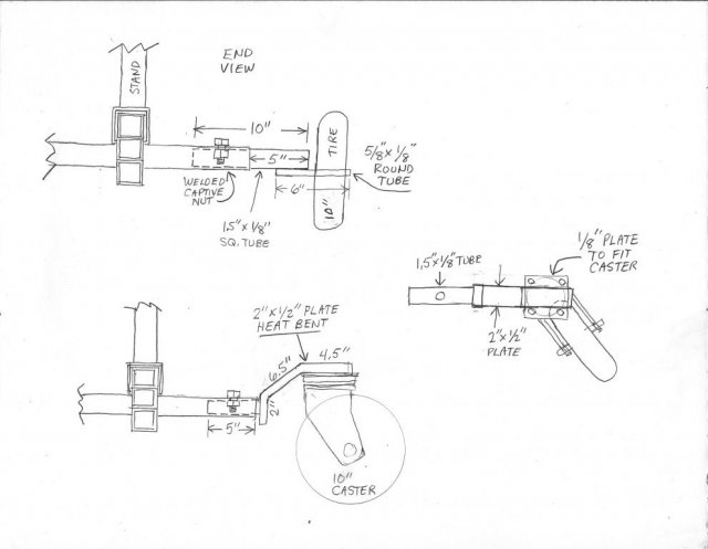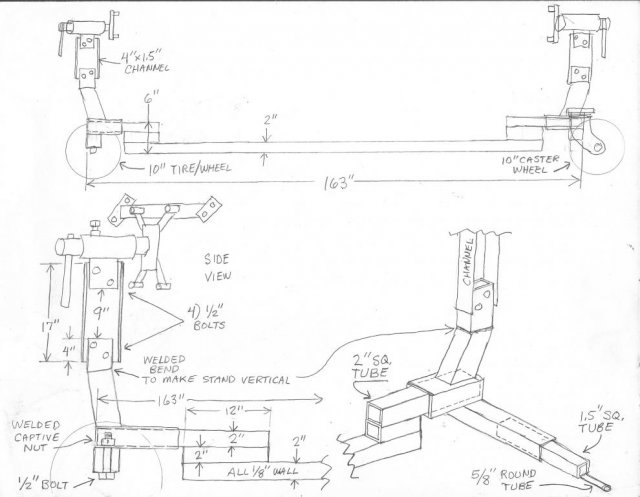 I consider a rotisserie to be a must have when it comes to a full restoration. When scraping off the undercoating, sandblasting, rust patching, and painting it's a lot easier if you aren't crawling underneath. It also much easier/ better to weld if you can maintain an optimum horizontal position. Rotisserie made from Harbor Freight engine stands. 2) Harbor Freight heavy duty engine stands 2) HF 10" pneumatic wheel / tires 2) HF 10" caster wheel / tires 1) 20' x 2" x 2" x .125" 1) 10' x 1.5" x 1.5" x .125" misc, 1/8" plate, 2" x 1/2" strip plate, 5/8" x 1/8" round tube Approx total parts / materials cost, $250.00 The HF engine stands come apart by unbolting. You remove the forward leg on each stand and replace it with tubing that runs the length of the car and connects the engine stands at either end. You replicate the captive nut assembly method so it can be dis-assembled. The engine stands are not wide enough to be stable with a car bolted up, you have to extend the sidewards legs outwards. The rubber tires were utilized to make this rotisserie roll on a gravel driveway. You could probably utilize smaller wheels and avoid the complicated 10" caster wheel mount (the most difficult part of the build). But you have to watch ground clearance. To maintain ground clearance with smaller wheels you could make the lower 2" sq tube go straight across with no spacers and raise the car for turning clearance by making the 4" x 1.5" vertical channel extender taller. The casters do not turn very well, you have to turn them in the direction you want to go then push the assembly. The vertical part of these stands lean backwards to counteract the weight of an engine. In order for a car body to turn smoothly the vertical support must be made completely vertical so the turning axis aligns between stands. Note the welded bend in the drawings. When fabricating the body mounts build the plates that bolt to the body, then bolt them to the body, then measure the 1.5" square tubing between them and weld it on while the body plates are bolted up to the body. In the front it may be good to put some washer spacers between the plate mounts and the body before welding. The weld distortion can make for a tight fit with no spacers. All the holes on the front and rear mounts can be drilled a couple sizes larger than the bolts to account for weld distortion. Or just hog them out if they don't line up after welding. Note the potential spacers where the body mount bracket bolts to the turning part of the stand. You may need spacers to clear the body / stand when it turns, and the mount bolts will have to be longer. I made the sideways extender legs to be removable so the engine stands could be used for an engine, but they could be welded on directly. The 1.5" sq tube could be substituted with 2" sq in that case. I also made the vertical 4" channel extender bolt on, this could also be welded directly. The channel could then be substituted with rectangular tubing but the vertical on the HF stand is an odd size. I would leave the center connecting piece as a bolt on so the rotisserie can be dis-assembled for storage. I've found that it's easier to just buy another engine stand than to unbolt and rebolt everything multiple times. Plus there's cases where you have an engine on a stand and need the rotisserie at the same time. The overall length of the rotisserie should probably be "to fit". Maybe make it a little long before you do any final welding. Or make the piece that bolts into the bottom of the stand longer and then cut to fit after the body is bolted up and checked to see that it turns 360 deg. Or just make the 2" sq tubing extend out the back of the stands. That way the stand is more universal for longer cars.