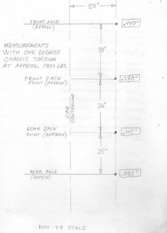 Additional torsional rigidity testing. Same vehicle with an added roll cage 1.5" x .125 wall DOM tubing, some 1.5" x .095" Six point roll cage with an additional eight body-to-cage gussets of .095 sheet metal. At middle and top of A-pillar, and middle and top of B-pillar (back of door) 2400 pounds per degree, so about a 20% gain. While doing the torsion test also measured between the front strut towers where a conventional strut tower brace would normally go. Zero measurable movement. -