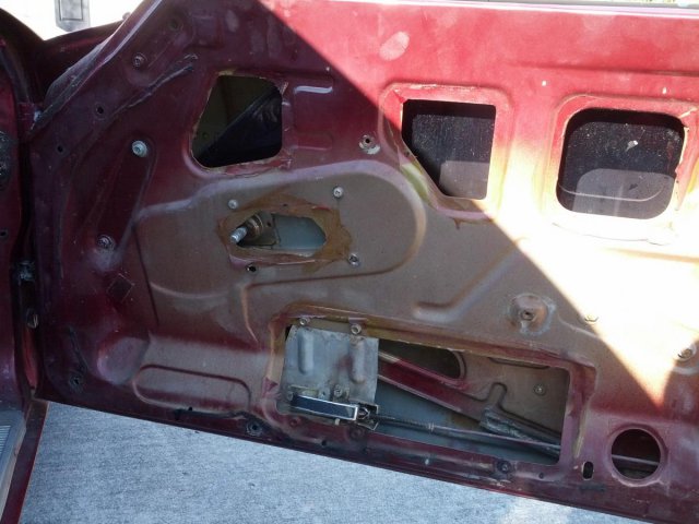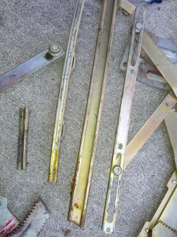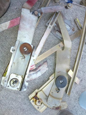 Since I got my '75 280Z, the passenger window hasn't worked. Once it came down, it stayed down. I figured some part of the regulator was broken, and decided to try to fix it. I found very few threads discussing it anywhere; the best I found was a service manual at XenonS30. This is also where I discovered that they changed the regulator design in '77, making the pieces way beefier. Oops. I ended up just re-greasing mine and putting it back together, worked like a champ. I took what pictures I could; I apologize that everything isn't documented. As the afternoon drew longer I got tired of taking off gloves to snap a picture. Side note on that, I strongly recommend you wear Mechanics Gloves during this. You'll be reaching inside the door a lot, and while the metal is rolled, it'd be quite easy to slice your finger. You will need: Optional: A new regulator set for a '75/'76 280Z. I imagine the procedure is pretty similar for the 240Z and later years of 280Z (2+2 has more parts involved, sorry guys), so do what you can. Not optional: Lithium grease - I recommend the white spray variety, but I used high temperature goop because it's what I had. Large Philips head screwdriver 10mm wrench/socket - almost all the bolts are 10mm with an integral Philips head. Wrenches/sockets have a lot more torque potential than the screwdriver, but use what you want. Start by removing the door trim. Mine was held on by three screws; one clearly visible on the upper left of the armrest (I assume there's a cover over it normally), and the other two sunk into the lower part of the armrest. There are also some plastic snap-in pieces on the perimeter. My interior is in pretty bad shape overall, so these popped out quite easily for me. YMMV. Note that you have to pull off the following two pieces to get the door trim off. Clearly aftermarket (previous owner), these just unscrew. No idea about stock. The silver plate that covers the door latch is held on by a single black screw. OK, pull the trim piece off! It should look like this when you pull the trim off. The two screws/bolts on the far left center hold the front guide channel (called a front sash in the manual) in place. The two screws in the middle (yep, there should be four - that's how I found it) hold the crank assembly in place. Kind of washed out, but the two nuts in the oval indentation, right side, above the hole - those hold the rear guide channel in place. It has studs attached to it, which protrude through the door. There are two screws/bolts holding the door handle to that metal plate at the bottom. Remove them, and wiggle the cable off the handle. The four nuts holding that metal plate in place come off, which allows you to pull the plate out. You'll need all that room, believe me. You also need to pull the window trim (the metal runner along the top of the door, parallel to the ground) and the door sash (metal trim that the window rolls up into) before you can remove the regulator and glass. The trim just pops off; the door sash has screws/bolts - two on the leading edge, on the first angle going forward from the flat; three on the trailing edge, where it meets the door jam (one at the bottom, two near the top). You also need to remove the window crank - mine was already off, as it was broken. From what I've read, there's a C-clip you have to pull off with needle nose pliers. There's probably a better way to remove the assembly; I unbolted everything (supporting the window) and then pulled it out one by one. The window comes up through the top with some trouble, and the crank assembly comes up with a lot of trouble. The manual states it can go through the holes in the door, but I wasn't able to do that. Pull everything out however you can. These two demonstrate the year differences. The newer looking stuff is froma '77. Not only is it beefier, the arrangement of the spring and gear is different. And, this is where the pictures stop. Not much to it after this. If you have a new set, make sure the guides are well greased. If you're re-using your set, as I did, clean everything off well, and re-grease. I used PB Blaster to get the old gunk off everything. For re-installation, the easiest way I found was to install the front sash first, but only secured with one bolt. Angle the window towards the front of the car and slide it down, then line up the guide rail on the window with the front sash and partially slide it in. Use the window crank to raise/lower the regulator until the rollers are near the guide rails on the window. Use force, coercion, and magic dances to line them up. It took me about 10 minutes to get all three of them aligned. Note, you can pop the long gear off the crank if you force it past its normal range of motion. If you do that, you'll have to pull the regulator out and push the gear against the tension spring to get it to re-engage the crank. Once they're all in place and tightened, raise and lower the window, making sure all the moving parts are greased as you do so. Replace the door sash. When you roll the window up, you will probably notice that it's cockeyed in some way. If it's wrong parallel to the top of the door sash, loosen and adjust the front sash (the long guide near the front of the door). If it's cockeyed fore or aft, loosen and adjust the guide channel (the small one to the rear of the door) - specifically, if it angles to the rear of the car, move the guide channel up; if it angles to the front of the car, move the guide channel down. Once the window is aligned, replace all trim, and hope you don't have extra or missing bolts.