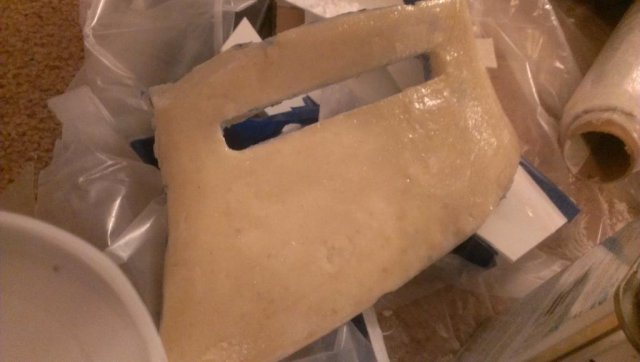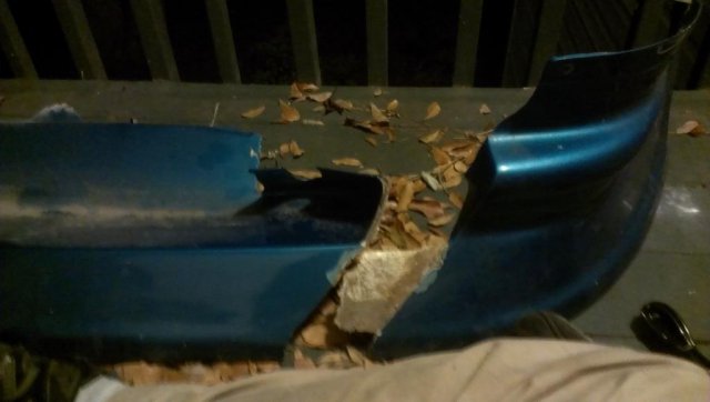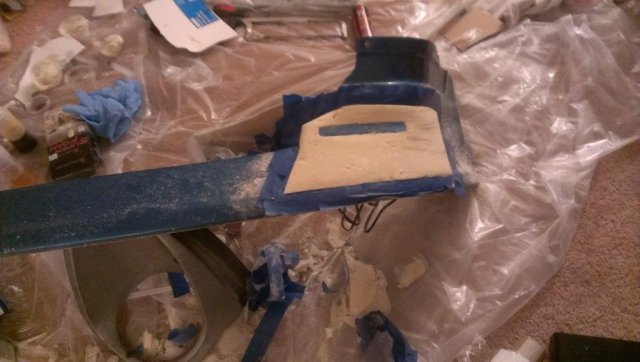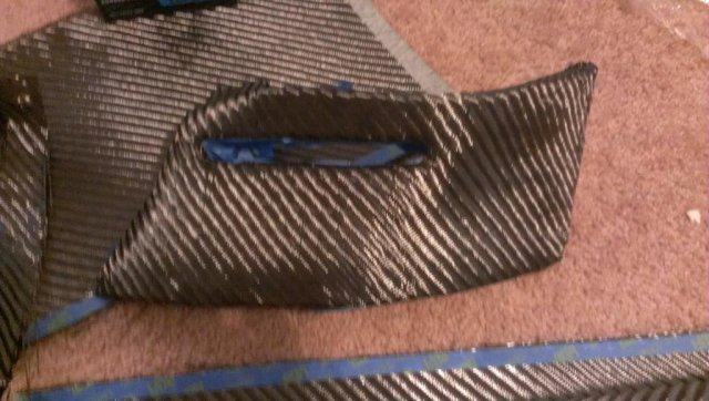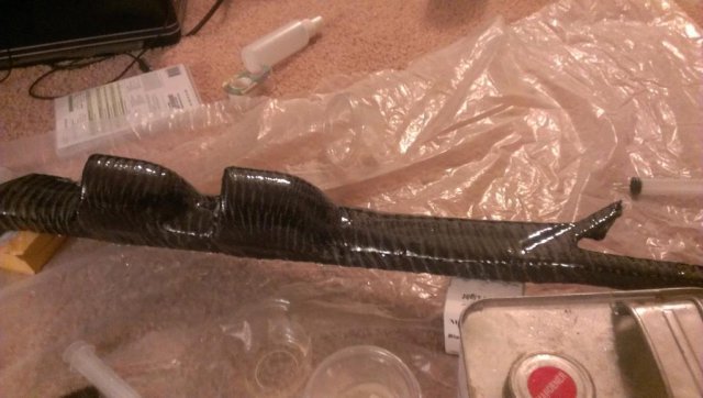 I am also adding daytime running lights to the car. I miss having fog lights and since I plan on doing leds for headlights and tail lights, I am installing phillips 8s in to the front air dam. I'm glad I started, I found that my air dam had cracked all the way through: So I peeled off the old fiber glass someone had attempted (very very poorly) to fix the air dam with and added a layer of glass covered in West systems GFlex on the back side, then riveted a piece of aluminum in. Then proceeded to fit test the lights and cut out slots: I decided to use foam to make "inserts' for the lights, that way they can kind of conform to some shape. The air dam doesnt look too great with flat lights. That was after some serious shaping with 50 grit sand paper..what a pita. I added some colloidal silica to my epoxy until it was damn near peanut butter viscosity then filled in all the large divets, before it cured I put another coat on (I could not find my super light fiberglass cloth, otherwise I would have used that) then waited a day and pulled the form off: I shaped it a little more, then started with the carbon (starting to see a theme yet?) and began the process of doing wet layup. I was going to vacuum bag it, but the 3lb foam cant handle the pressure. Most of my other parts vacuumed quite well, it's just the slot for the light bends in too far. Ill post more once Im done. Im going to finish up refiberglassing the air dam and correctly fixing the crack while working on the light inserts. -