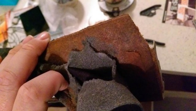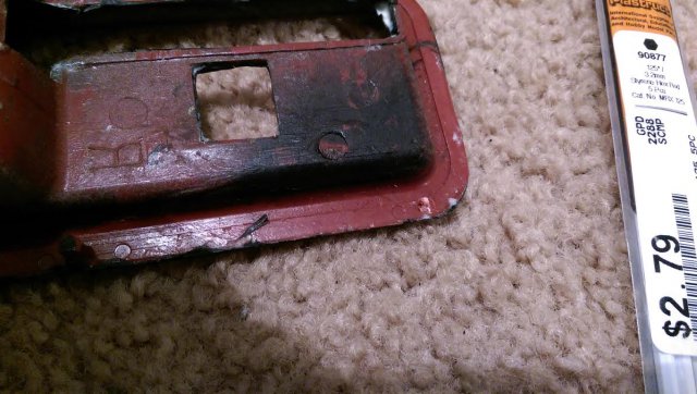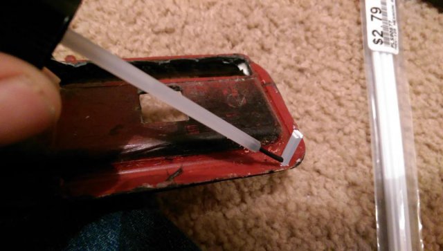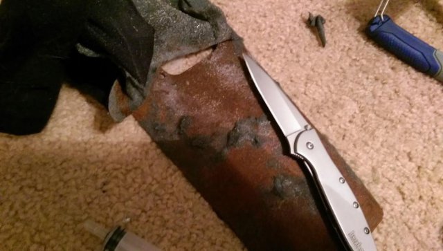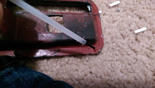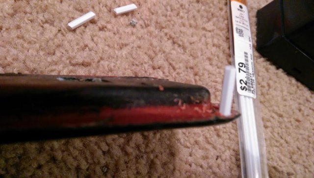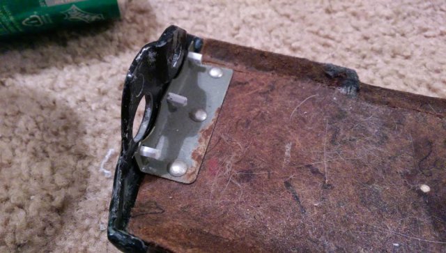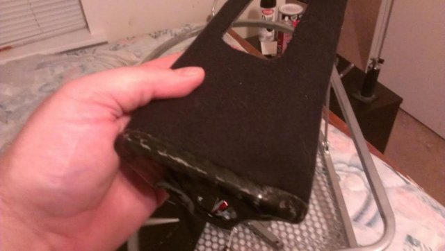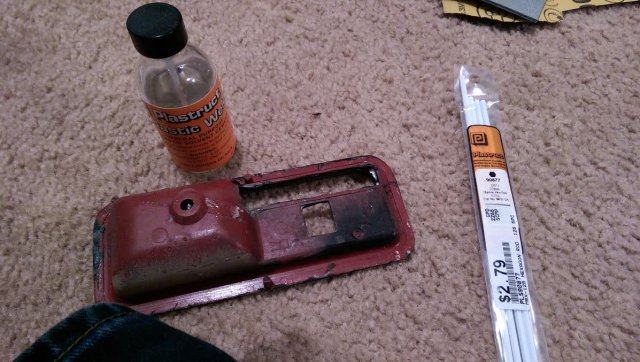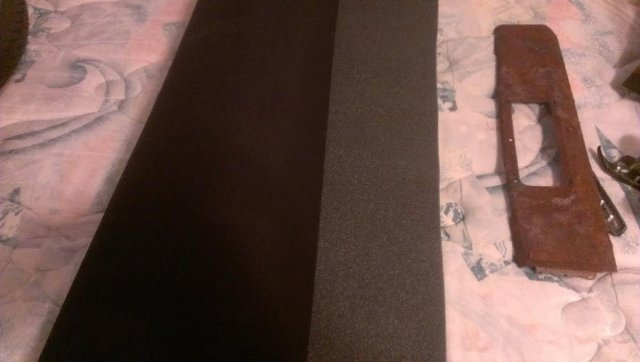 Hi everyone, I wanted to make a little "how to" for how I reupholstered the T-top inserts (dont know the actual name) on my 280zx. I had already completed the part once, but thanks to a sick cat, I had the pleasure of doing it again. Since I was going to do it all over again, I figured I could at least document it, with a few little tips I figured out myself (that apply to other interior pieces as well). I know when I first started messing around with interiors, I had trouble finding information, so I am hoping someone may find this useful. I will be doing my sun visors soon, if anyone wants a write up, let me know. First off, the part has to be removed, FSM or just looking at it should explain how it comes off, mine was already off and not installed (and covered in cat hair and snot): The first thing you want to do is remove the existing fabric, the plastic pieces are attached with pegs that fit through holes then are melted: take a knife and you can snap them pretty easily to get the parts off (I'll discuss putting them back on later): Most of these pieces on our cars is just chip board with a vinyl attached using adhesive, rivets, and staples, the staples in this case need to be removed: Now remove the material: Vinyl usually comes off relatively easy, be careful not to destroy the chipboard piece, since I used headliner material on mine....it tore apart and was a little more difficult, to make it easier you can use acetone and a knife to scrap the stuff off (works really well for headliner pieces). Once done you should have a "clean" part: If you are recovering with vinyl, you may want to run coarse sand paper over the piece to make sure and get everything even and all original fabric off. Any little piece left can be seen or felt through vinyl. I purchased some headliner fabric at Joannes, it's really easy to work with and relatively inexpensive. Lay the part on the fabric and cut to size...well, close to size: I prefer Super 77 for attaching light fabrics, it is somewhat forgiving and, if used correctly, makes a pretty strong bond. I coat both the fabric and the part in glue and let set for about ten minutes until they are both tacky then stick them together: Check to make sure that there are no large bumps in the surface and that it looks nice and even: If it looks good, trim off the excess on the parts where the fabric sits flush and the other edges keep about half an inch to a quarter of fabric hanging over so that it can be securely fastened to the bottom. The Super 77 and other spray adhesives I have used are all really good at clinging to surfaces, as long as there are not too many bends or complex curves, but if there are they seem to want to release over time. My solution to this is Weldwood contact cement, my personal choice, there are others that work just as well I am sure. You can attach the excess to the back of the part using staples if you wish, but I could not find any more really shallow staples, so I went ahead with my contact cement. I added the cement to the excess fabric on either side and to the back of the part itself. (not very noticeable) Then I waited about thirty minutes for it to become quite tacky and rolled the excess onto the part as tightly as I could. Normally you would want to start from the middle and work your way out, since this was a smaller piece it really didn't make that big a difference. Let this set while you go and tend to your plastic pieces. . . . . . . .. . This feels like one long run on sentence, sorry for that, . Now to the plastic pieces, I had cut the little pegs off of the parts, now I need to fix that so that I can reattach them. First you need materials: I could not find ABS rods, but I was able to find 1/8th inch styrene rods, a plastic "glue" a power drill with ~1/8th inch bit..some flexibility here and the part. The glue is actually a solvent, Instead of sticking the pieces together it actually "welds" them. It dissolves the plastic into a paste, when it evaporates out you are left with a rigid plastic once again. If you have a crack in a plastic, or a chip, you can dissolve some shavings with the solvent and use it as a filler, just do not go on too thick or the solvent cannot dissipate and it will look horrible. I use to use acetone for attaching a lot of plastics, it works extremely well for acrylic, but doesn't seem to hold as well on abs and other automotive plastics (for me). This particular solvent is mostly MEK based, which you could buy at most home improvement stores, MEKP is used as a catalyst for lower end fiber glass resins and I have heard that it works to weld plastics, but I have never tried it myself. Take the piece and locate where the peg was, then drill this area out Spot found Be very careful to not go completely through the piece, we are just trying to increase the surface area that is being contacted as well as aid in holding the peg in place long enough to stick. You should end up with a shallow divot Now add a large drop of solvent into this hole and let set for a few seconds While the solvent is setting, go ahead and cut a piece of the rod off, longer is better than shorter, usually I start with a little under a 1/4" Now shove the peg into the divot, twist it so that it will conform to the shape of the divot then hold it in place a good twenty or so seconds, until you can let go and it does not move: Now add some more solvent around the base of the peg, I like to push shavings around the base to build it up a little and hopefully make it a little stronger: That's one down, now go ahead and do the rest. I sometimes take my chances with the original pegs if they were not broken completely off, but it is probably best to go ahead and replace them all. I let the solvent do it's magic for a little bit then I do a test fit to make sure that the pegs line up with the holes on the part, as long as you do not wait too long (time varies with conditions), you can still move them around a little. Then I let the