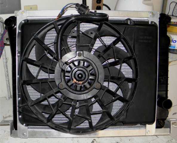 Mounted my Taurus fan to the radiator. I considered several different options after looking at many pics here at HybridZ. I eventually settled on what turned out to be a pretty simple solution. I attached the vertical plastic edge flange on each side of the shroud to 1 1/2" x 1/4" aluminum bar using stainless steel rivets.. The bar width is enough to extend to the existing mounting bolts for the threaded 3/4" aluminum bar that came on the JTR/Stealth radiator brackets. I simply drilled holes in the new bars at those locations and used the same bolts to reattach everything. I think it looks pretty clean.