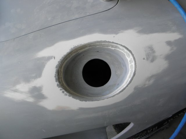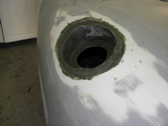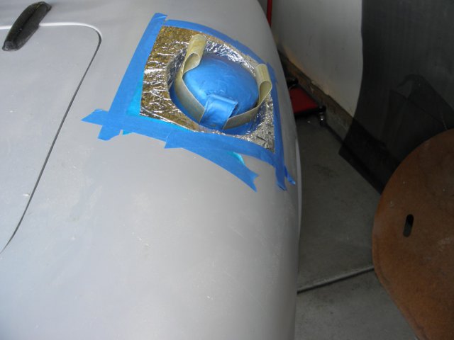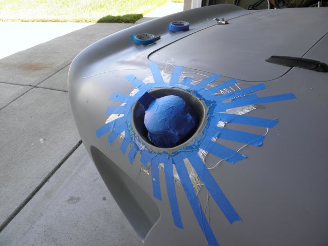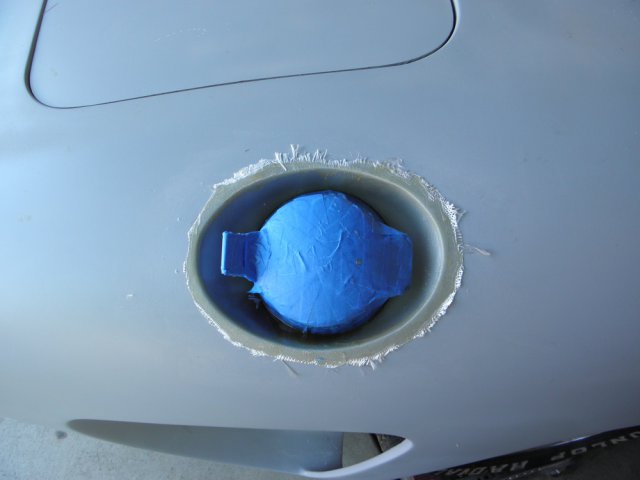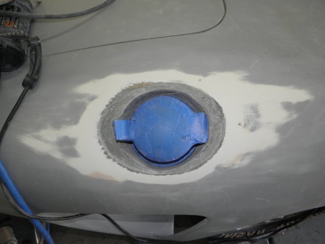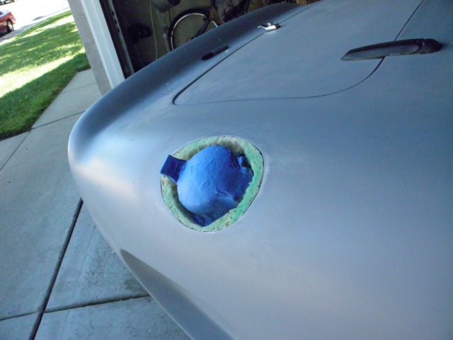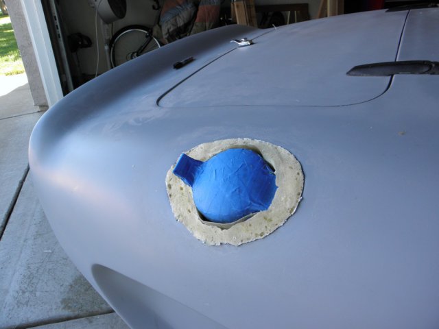 Working on the fuel pocket today. It's too big for my taste, so I'm trying a couple different looks. The walls are set at right angles to the bottom... ...I created sloping walls, by stretching fiberglass cloth from the center hole to the pocket edges and securing it with tape. The resulting insert... ... makes for a more appealing pocket. But I still think it's too big. To get the pocket tighter to the gas cap, I lined the pocket with foil... ...inserted the gas cap... ...and filled the gap with expanding foam. A little trimming and carving... Some more carving and I think I'll have something I'll like. I'll use the foam plug to make a piece that can be permanently glassed to the body.