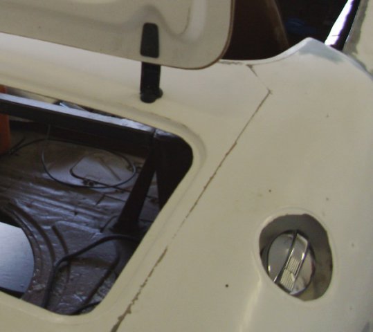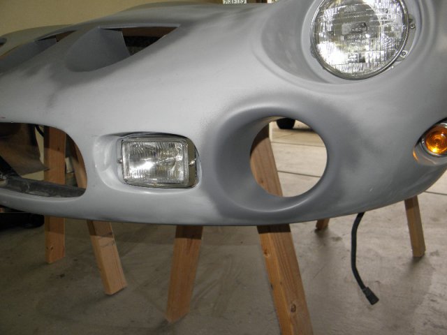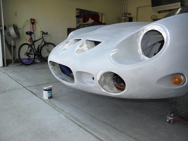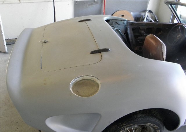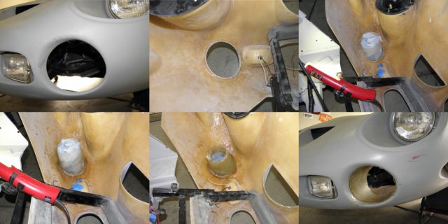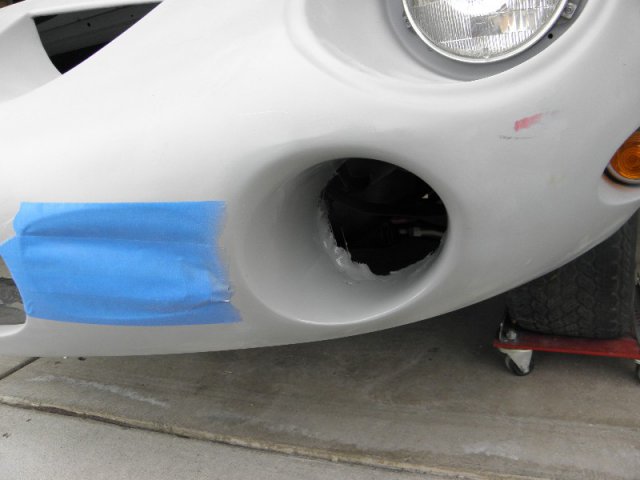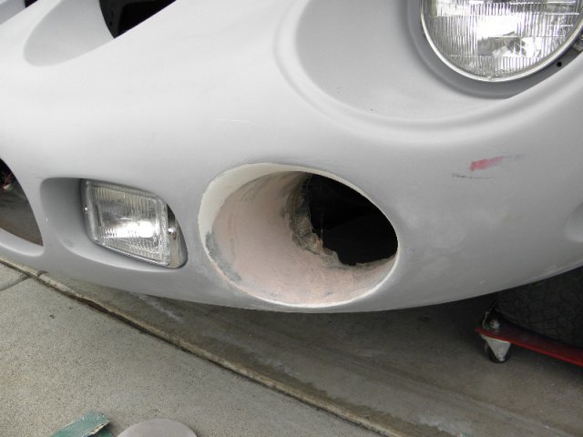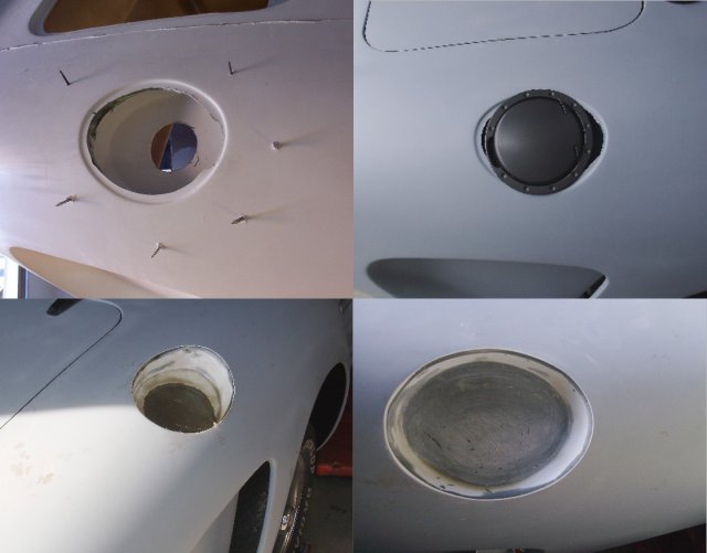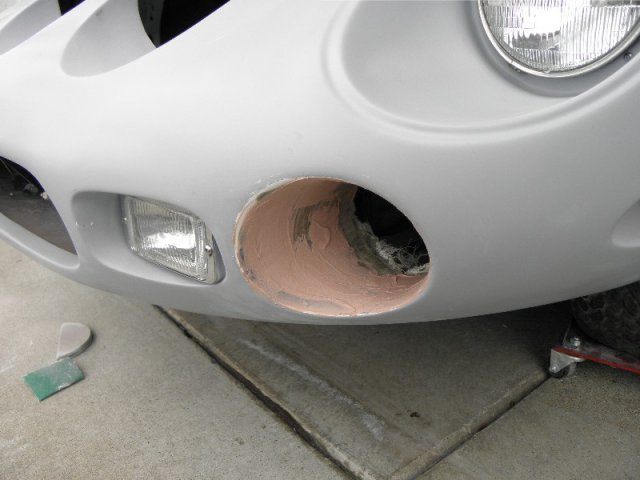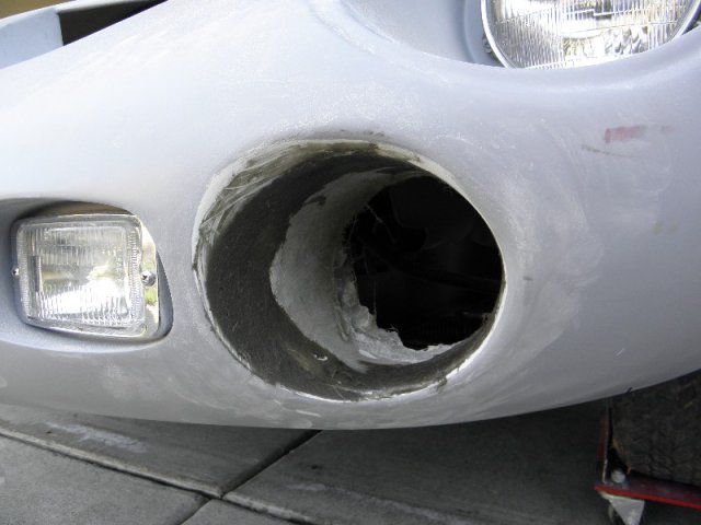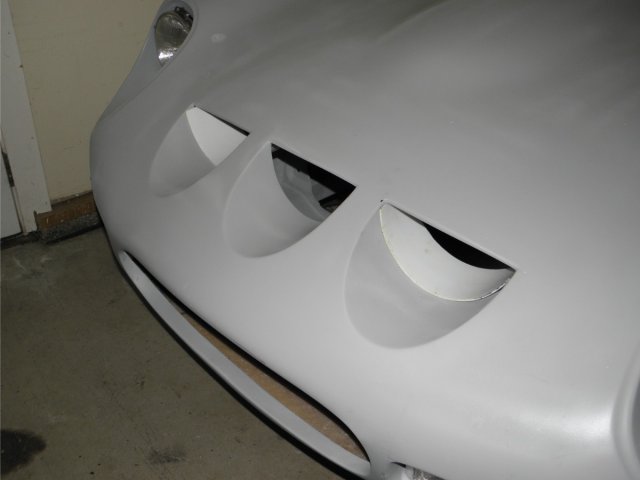 More Body Mods I'm still short on "cabbage" for parts. I don't want to loose the momentum I've build up in the last month, so I'll keep working on the little body mods that don't cost much in materials. The lower round vents on the bonnet aren't deep enough for my taste, so I spent a little time this last weekend extending them. The process was pretty straight forward. I taped an empty plastic potato salad bucket inside the vent to form a mold. I wrapped cloth fiberglass strips around until I got the thickness I wanted. I'll trim them at the back and shape / blend the front openings later. I've changed directions a couple times on the fuel door/filler style. Originally I was going with the Le Mans style (read, expensive) gas cap, so I installed the optional fuel filler pocket. Then I found a nice filler cap, at the wrecking yard, from a Jaguar that was far more cost effective. But after a while, the size and style just didn't seem right. The next incarnation consisted of a plastic door/pocket assembly from a '90 Miitsubishi Eclipse. It's contours are very close to the curve of the VR's fender mount location, and for the longest time I thought this was the way I was gonna go. So I trimmed out a nice big hole in the fuel pocket to accommodate Mitsubishi door assembly. But I want something in chrome or polished aluminum to match the door handles and the trunk latch and hinges. Turns out, the "chroming" process for the plastic makes the final product almost as expensive as my first choice. If I'm gonna spend that kind of money on such a detail, I'm gettin' the real thing. So, I filled the hole in again. Guess I'll just bite the bullet and spend the money... that is if I ever scrape it together.