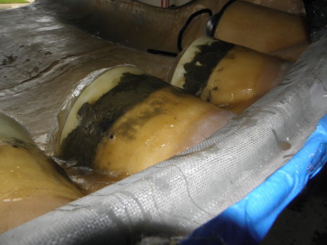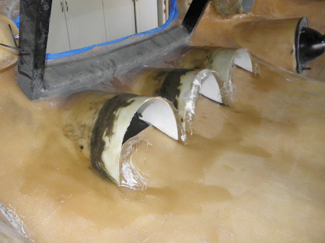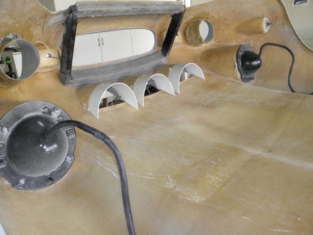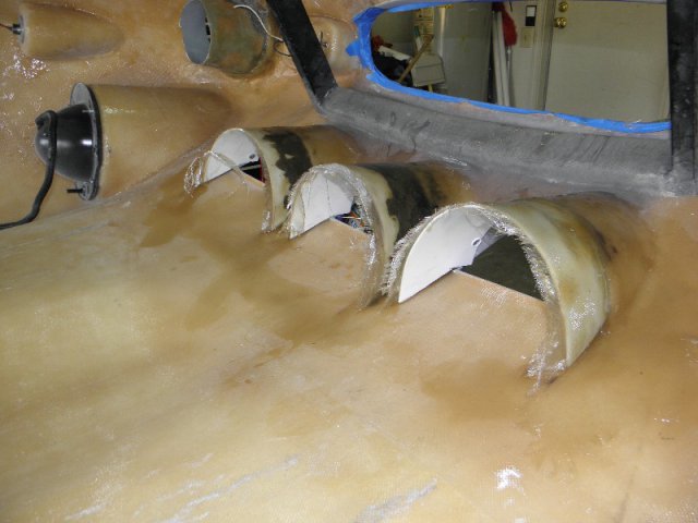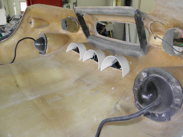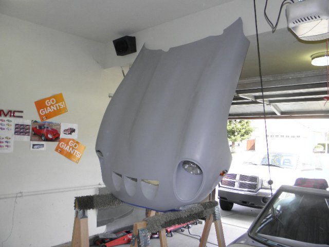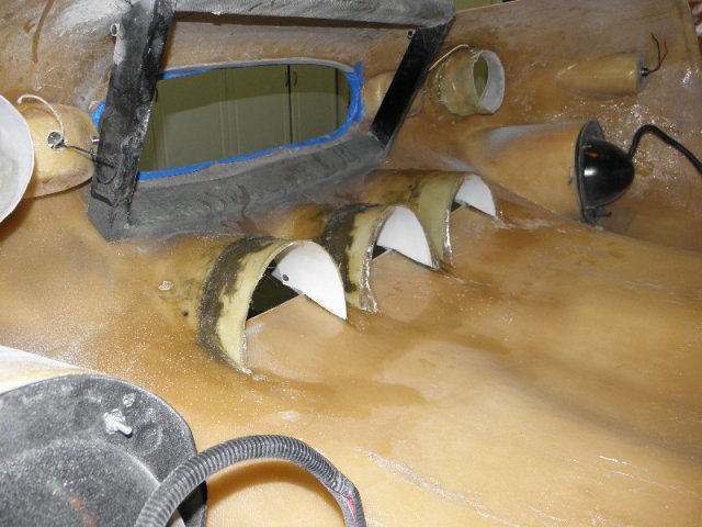 OK... found another bucket... made another form... and now it's glassin' time. Flipping the bonnet over on a couple of saw horses gave me the perfect working height. The forms were held in place with a few screws. I worked through the nose opening, as trying to get to the scoops from either side was quite awkward. Can't wait to get the forms off and do a little finishing. Perfect activity for the rainy whether here.