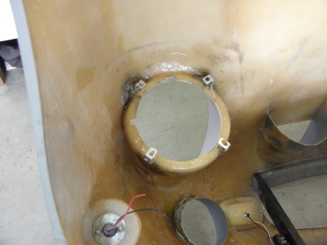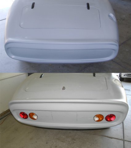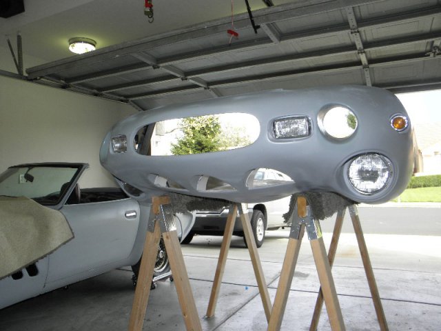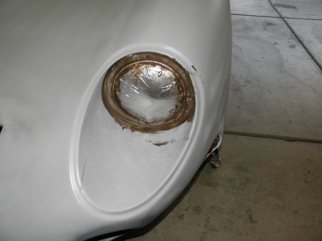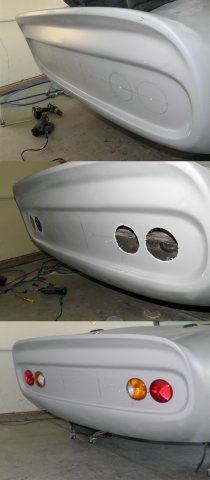 To achieve the look I want for the headlights, I glassed-in four metal brackets to the back side of the front scoops. A little short strand fiberglass filler to 'glue' them in place and several layers of cloth and resin to completely secure them. I wrapped the headlight in foil and mounted the whole assembly. A little more filler to fill in the irregular gap... ...and some light sanding yields a perfectly round hole. I then turned my attention to the taillights. After many hours of debating the exact locations of the lights, studying the curvature of the back panel, measuring, remeasuring, marking, erasing, remarking (in the exact same places) and then doing it all over again, I finally worked up the nerve to make that first cut. A rotary tool made easy work of the cutting and sanding of the fiberglass. The old Datsun sheet metal underneath was a different story. The depth of these lights, approximately 3 inches, required the modification of the old valance underneath. Limited access through the new holes, made for slow work. After a couple of hours of small cuts using the rotary tool cut off wheel and a reciprocating saw, and some adjusting with a hammer and short length of pipe, there was finally enough room to slip the mounting brackets in and bolt the lights up tight. ( Pics of the mangled sheet metal are too gruesome to post.) I may adjust the orientation later, but for now I'm satisfied with the look.