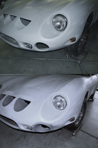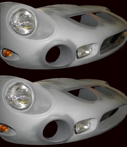 Standing the bonnet on it's nose makes for easy clean up to the underside. Still needs some sculpting to completely eliminate the joint lines, but looking pretty good so far. The last of the cosmetic fiberglass work to the front will be to extend the inner lip of the large opening like in this Photoshopped image. The headlights will be remounted to the inside of the hood for a cleaner, more modern look.