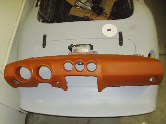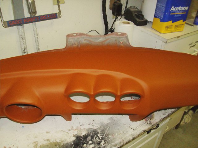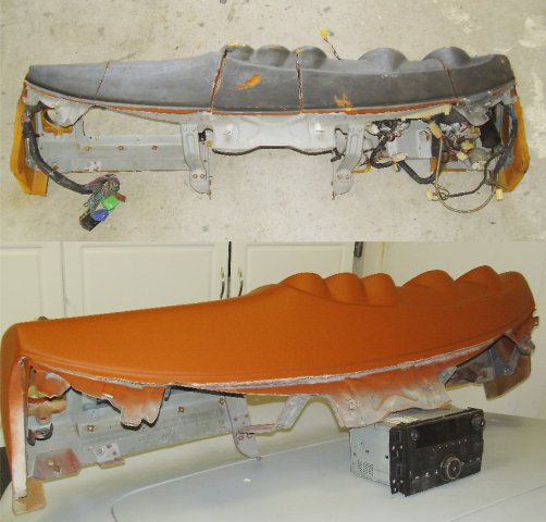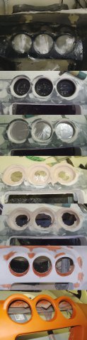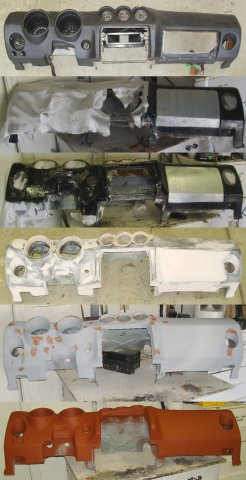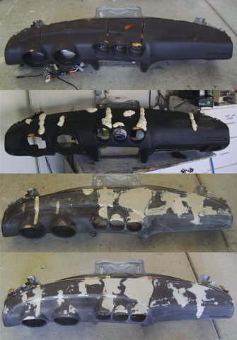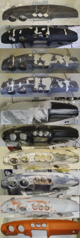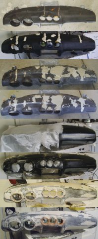 I had the very same experience with the SEM products. The final result looked like crap and was very brittle. So. I also went the fiberglass route. Here's a composite photo of the dash so far. Covering the dash with fiberglass cloth produced a very hard surface and no cracking when it was bolted in for test fitting. Not sure if I'll go with the textured look, paint or try to cover with some kind of material. Dan Juday has a very nice dash, with a smooth finish, painted the same color as his car. That's the standard I'm shooting for.