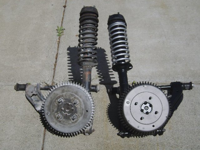 Forging ahead, I've managed to blast and paint the suspension all around the Velo Rossa. The front strut housings have been sectioned and now contain new ZX struts. New ball joints, tie rod ends and rotors up front.