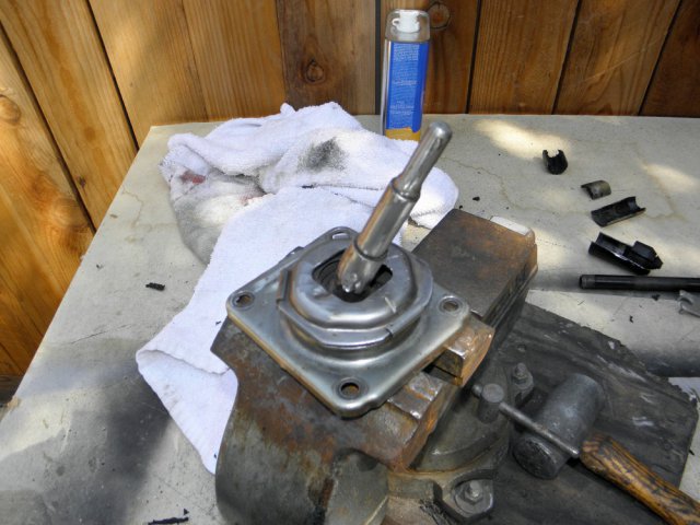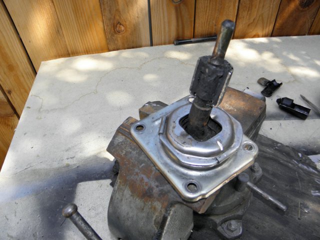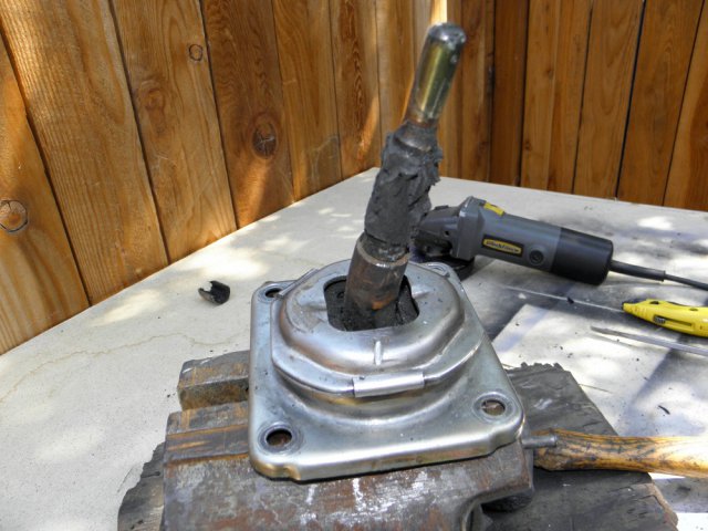 Started to move the gear shift lever to the center of the console opening today. The old lever is made up of an outer hollow tube attached by rubber to an inner solid steel post. Using my small grinder with a cut off wheel, I cut off the upper portion of the tube just above the rubber, split the lower portion and rubber down to the post and peeled each section off with a screwdriver. Scraped most of the remaining rubber off with a utility knife... and ground the post clean with the grinder and a 3M flappy pad. Back in the car, I'll do some eyeballing to get the right angle before welding an adapter plate to the post.