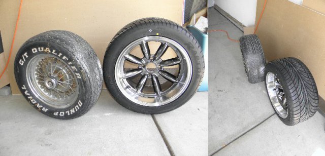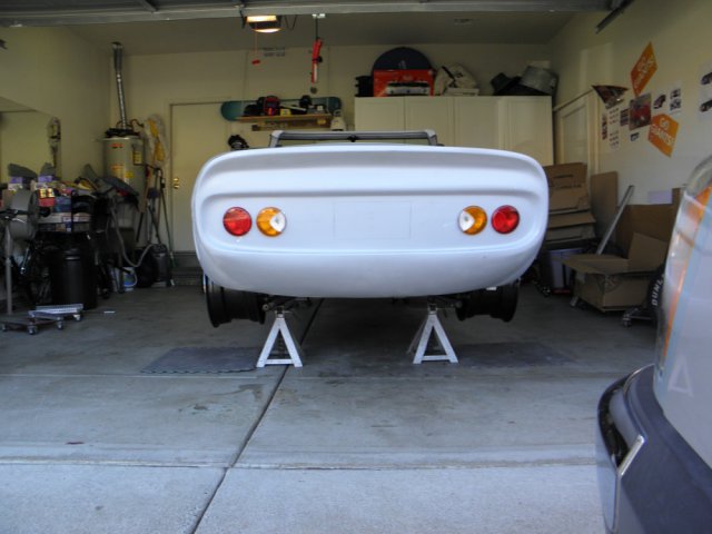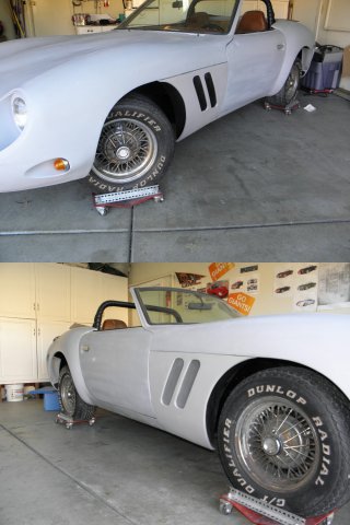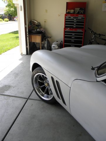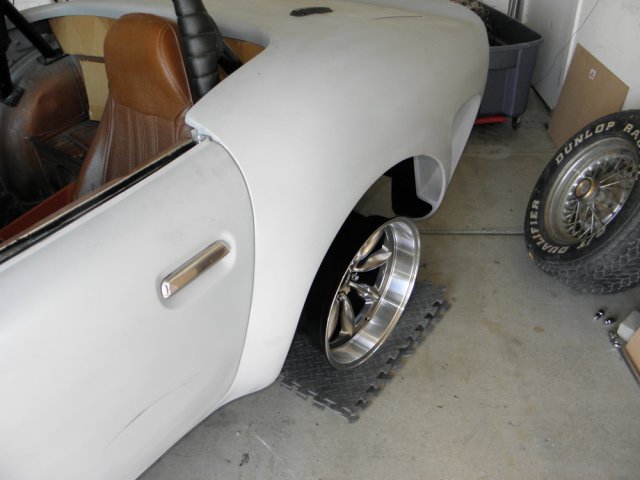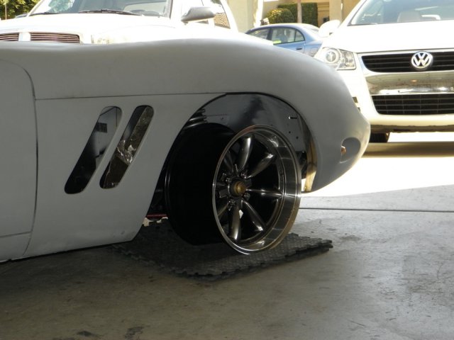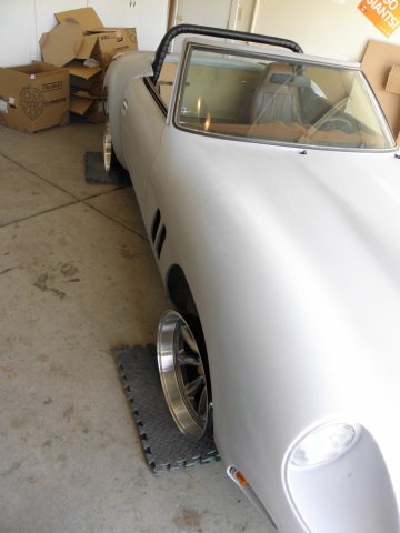 After three days of conflicts, I was finally able to pick up my new wheels. I spent no time getting them on and checking for clearance issues. The fronts are pretty tight, and depending on tire width, may need a small spacer to keep from rubbing against the spring. Even if no spacer is required, I may opt for a small flare to the front fender openings to get that hunkered down, slightly wider look, that I've seen on some of the Porsche Speedster replicas. Looks like the rears will need an adapter to push them out around an inch (again depending on tire width) to fill the tub completely. I anticipated this. Rota RB Royal Hyper Black Front: 17x9 -13mm Rear: 17x9.5 -19mm While I wouldn't describe these as "top of the line", I do feel they are a great value. For me, they are a good compromise between the styling I want and cost. I get a deep dish,slightly muscle car look, and save some cash by utilizing the stock suspension / brakes, etc. Custom wheels made to the specs I need are three times as expensive. Who knows, I might even placate some of the Ferrari guys who feel that wire wheels are the only way to go on these cars. Eight spokes with that Torque Thrust look?? Not enough spokes? Oh well, I like them. I tried to get the suspension to approximate ride hight, by supporting the car on its suspension as close to the outside as possible. But as one can see, it didn't work out that well. Can't wait to get them wrapped in rubber and finalize the stance. Alas, it won't be soon. But there is some light at the end of the tunnel.