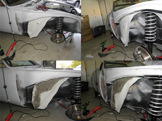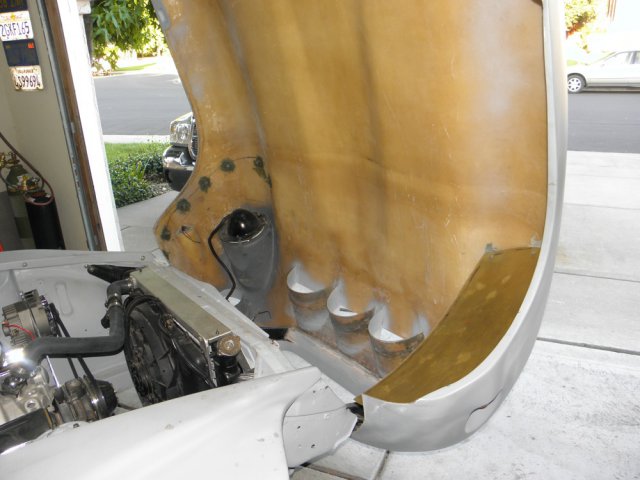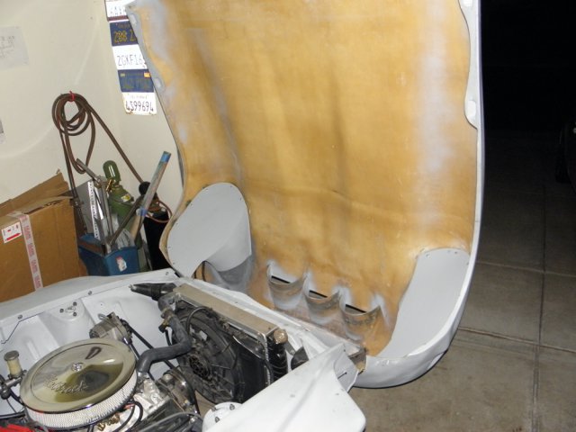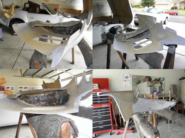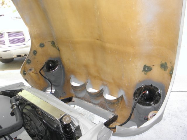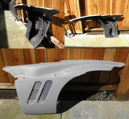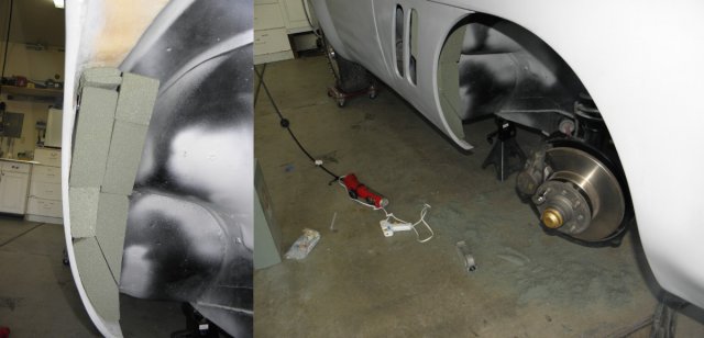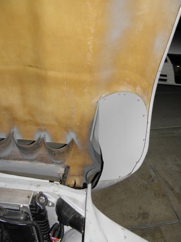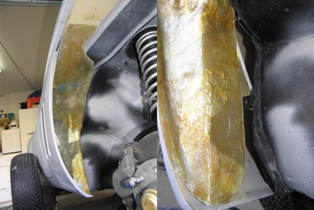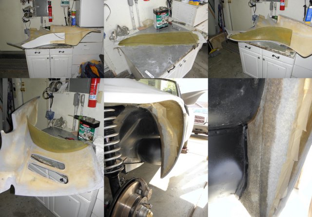 Been dealing with a sore throat and sinus infection for the last week. Was feeling much better today, so I decided that my compromised respiratory system needed a good dose of fiberglass/bond dust to make my recovery move right along. Got around to finishing the front inner fender/headlight covers. Spent most of the day filling and sanding and I'm pleased with final result. I was going to finish them with undercoating, but it's been suggested that spray truck bed liner might be better.