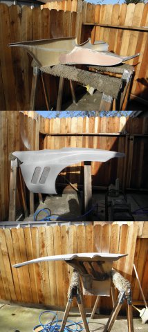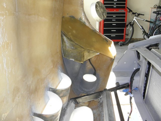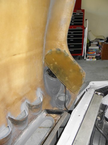 Still working under the front fenders. Quite a while ago, I started making a block off panel behind the front tires. It'll keep crud thrown up by the front tires from getting to the door hinges and side vents. I hot glued floral blocks to the under side of the cheek panel and shaped them until I got a curvature I liked. I removed the assembly, covered the blocks with foil and coated them with a layer of fiberglass cloth. After removing the blocks, the new piece fits nicely between the cheek panel and unibody. But there is still a gap I'll have to close. Using some sheet metal, I attached a sheet of fleece to the bottom of the upper frame rail. A little resin and it conforms to, and holds the shape of, the old body. I reattached the cheek panel with the new block off and wrapped the fleece around the edges, pulling everything good and tight. More resin... ... and it all comes off as one piece. All three pieces are tacked together only where there was actual contact with the wet resin. I reinforced all joints and filled any voids with fiberglass matting and filler. After some trimming and sanding, it's still pretty rough, but it'll get a lot more attention before finished.