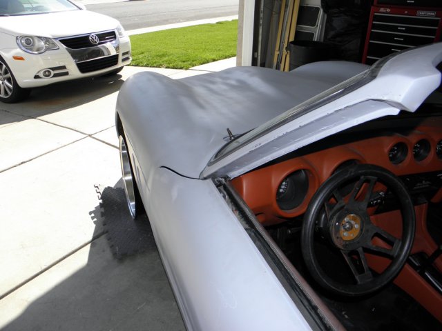 The VR left the garage today under it's own power since... well, ever! I spent the last couple of weeks working out the ride height and desired spacing of the wheels within the tire wells. The front wheels got 1" spacers which lets me use the Rota center caps, avoiding the ugly dust caps protruding through the center holes. The rears needed 2" spacers to allow the tires to fill out the wells. I really like the stance. Unfortunately, pushing the wheels out created a couple of clearance issues with the body, when turning. Easy fix. A little trimming to the corners of the tilt bonnet and to the edge of the inner blockoffs I made for the fenders, and everything is in the clear. I'm still waiting to install pipes and mufflers, but I just couldn't wait to see if she'd actually drive. So, with more than a little apprehension , I fired her up and backed her down the driveway into the street. I took a couple of laps around the court and to the corner and back. And although the total distance travelled was probably less than 1K feet, it was exhilarating. There were no loud bangs, no rubbing noises, no strange vibrations and none of those tell tale smells indicating a major problem. Once back in the garage, I did find two small leaks. Fuel, from a fitting not completely tight and oil, from the pan-to-timing cover seal. I was feeling so good, that I took a few pics to commemorate her first day in the sun. And with the bright light, I was even able to approximate a metallic paint finish. All in all... one great 'feel good' day.