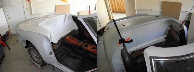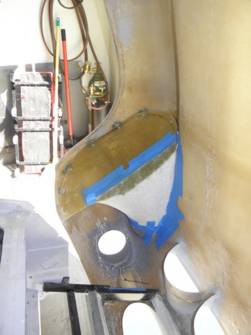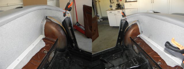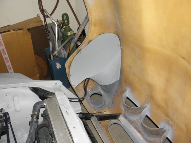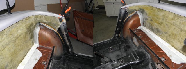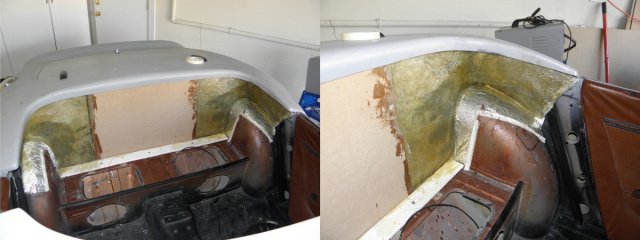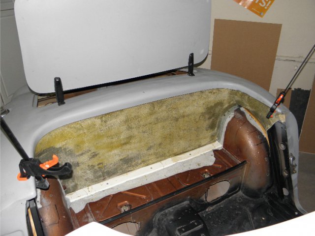 Had some time this weekend, so I started some of the interior work. I need to create new panels to separate the trunk from the passenger compartment and cover the added reinforcing steel. I made several attempts to generate patterns out of cardboard. I thought that would be simplest route. Wrong! A total waist of time. Too many square corners. Stretching fleece over such a large area seemed like the best way to go, but I wasn't sure how to secure the material under the lip of the rear tub while applying resin. Here's what I've done . Laid out the fleece and trimmed it . I cut 1/2" pvc pipe to length (about 72") and sliced numerous grooves in the areas where it needed to make tight bends. I then attached the top edge of the fleece with a little trim adhesive. The pipe bends easily and holds itself tight to the unibody at the door jams. It kept drooping in the center, so I pulled the pvc up tight to the fiberglass with small screw. I used an old gas tank strap to get it tight around the wheel wells and an old wooden trim molding keeps the fleece tight to the wall under the reinforcement. I need the area on top of the wheel wells accessible in order to mount the roll bar. After it dries, we'll see how easy it is to get out.