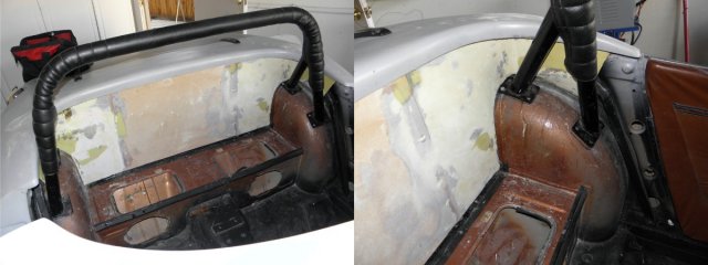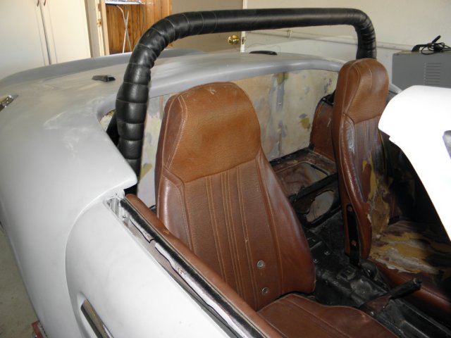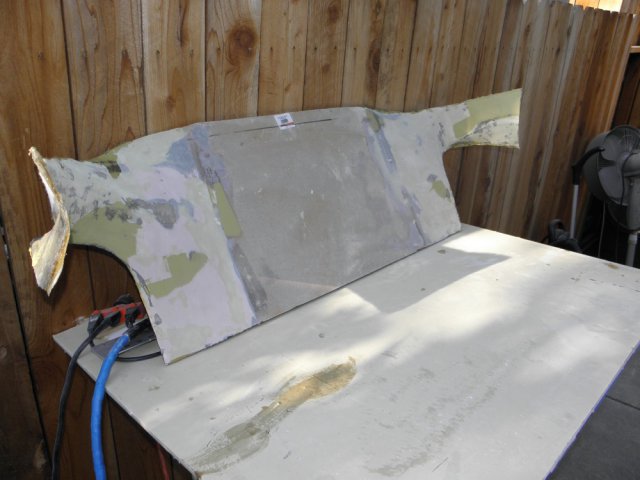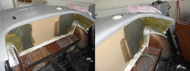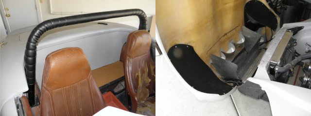 Well... the fleece and resin didn't turn out as well as I had hoped. I misjudged the amount of hardener to use based on the temperature outside. The resin started to harden before it saturated the fleece. The result was a very bumpy and floppy panel. I wasn't thrilled with the amount of work it would take to cover the whole thing with glass matte, to make it rigid, and then filling and sanding to smooth it all out. Instead, I replaced the center section with hardboard. It's already rigid and requires no sanding to get a smooth surface. I did glass the ends... then filled and smoothed. A little trimming and some more filler... and the panel fits snugly around the roll bar mounting points. A little more sanding and it will be smooth enough to cover. Interior is starting to shape up.
