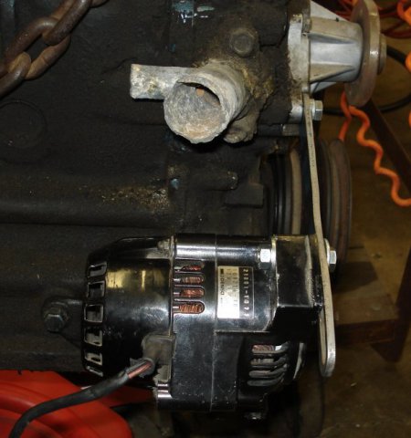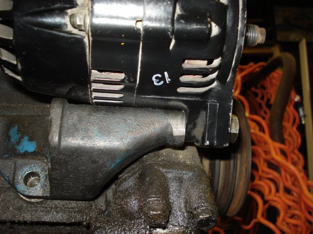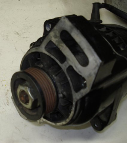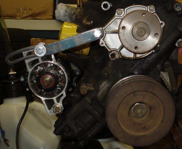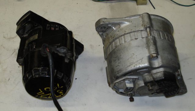 I have been wanting to install a smaller alternator in my 240Z for a while now. After reaserching the subject all I came up with was articles on swapping in higher output alternators. I am using my car for time trial events and hope to get into racing as well. I rarely drive the car on the street and have removed the heater, wipers, horn, and such to reduce the weight of the car. Since I do not need to run lights, fans, and the like I decided I might be able to save a few pounds by using a smaller alternator. After some thought I remembered that one of the motorcycles I use to own had a belt drive alternator, so I bought a used alternator and managed to fit it to the Z engine. The donor motorcycle is a 1987 Kawasaki Ninka 750. The alternator is rated for about 25 amps output which should be plenty to run the breaker point ingition and Holley fuel pump. The Ninja alternator in an internal regulalator type and weights in at about 6 pounds. The stock alternator and regulator weight in at 11.5 pounds yeilding a weight reduction of 5.5 pounds. The Ninja alternator used a micro-V belt so I will have to make a new pulley which is ok since I am not sure about the gear ratio needed for the new alternator. To get the new pulley aligned with the crank pulley I started by mounting the new alternator to a spare engine. The stock 240Z alternator mounts worked well with minimal mods. I had to grind a small ridge off of the front of the lower mount to clear the new alternator because the mounting ear is shorter that the stock alternator. I also increased the thread size for the pivot bolt from M8 to M10 because the Ninja alternator uses the M10 screw. The stock upper mounting/adjusting bracket needed to be flatened and shortend. I used one of the water pump mounting bolts to attach the engine end of the bracket which helped align the radius of the alternator end of the bracket to the smaller alternator. A few pieces of new hardware were requied. A M8 x 100 mm screw is need to attach the upper bracket to the engine. I had to shorten it a little bit so a 95 mm screw should work if it is available. The lower mounting (pivot) bolt is M10 x 40 mm. A M8 x 45 mm is used to attach the upper bracket to the alternator. The new alternator has an adjusting slot in it and so does the adjusting bracket, so I will use fender washers on both sides. An M8 x 45 mm bolt and nut hold it together. I had to make a small flat spot on one side of the rear washer due to the short mounting ear. The end result looks good. It is very rigid and should work out well. Now I need to make the pulley and figure out what length the belt needs to be.