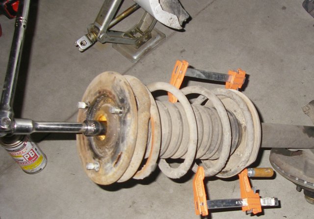 Tokico kit install I: Equipment needed A: 14mm box end wrench ratchet with extension and deep well 14mm socket. B: Tire removal equipment. (I love Pneumatics.) C: 17mm socket/ ratchet w/ ext. D: Dust boots for front struts. (These didn’t come with the kit from TokicoL.)$28.00 @ Schucks’ E: Break-free lubricant. (I don’t recommend WD40; there are many better solvents and cleaners out there.) F: Clamps or fancy spring compressor devices. G: Screw of various sizes, Flat head. (I used a small flathead mostly.) II: Pre-work A: I recommend locating the bolts that will need to be removed and soak all of the thoroughly before even attempting to remove the old hardware; maybe even the night before you plan on doing the swap. B: I did the rear setup first because it is much simpler than replacing strut cartridges. Use wheel chocks and jack stands throughout this process as the car will be off the ground for a prolonged amount of time. (I know…safety is boring, but let’s keep that way, heh.) III: Removal A: first off you will see the simplicity of this project when you remove the old shocks/springs. The Tokico kit has complete rear units; all of the old gear except the upper spring mount will be replaced. I checked my upper spring mount bushings and they were surprisingly in good shape so I re-used them. You can get new ones if you car is in need of them. B: I held onto everything to until I got the new stuff mounted the trashed the left-over’s. C: On the front struts it appeared more complex but it still what I would call Intermediate mechanic work at best, probably more like Novice. Here are some shots of the method I used to remove and replace the front cartridges. D: Remove the tension rods, the sway bar as well as the brake caliper before removing the strut tower bolts, my car has the knuckle keeping everything connected to the LCA. This wasn’t a problem I took it all apart while it was attached to the car. E: There is one tricky part to all of this. The cartridge retainer cap or the Gland nut Remember that when you are pulling the old gear you will have some compression on those old springs, if not done properly you can damage fender wells and body panels. IV: Installation A: The Rear setup is straightforward. Assemble the shock/spring with the bushing cap and bolt from the top to bottom. I say this because if you get the three bolts fastened up top (rear strut tower) then you can leave them loose and align the bottom of the shock to attach it to the LCA. Then tighten everything. Use factory torque specs for all bolts. I can look them up for anyone who doesn’t have a manual or can’t find them.