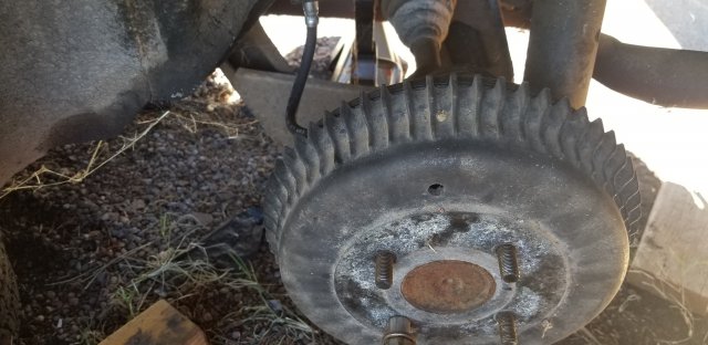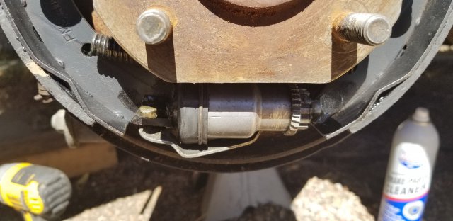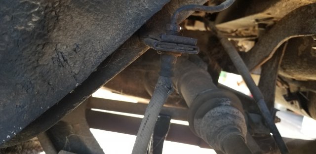 Well I got to work on things a bit more and unfortunately that brake bleeder is leaking which isn't so surprising. I put in a solid 1/4in bolt in with a little gray rtv until I can source a replacement cylinder cheap. I resembled the rear brakes with new lines and shoes and bled them, they do not seem to be leaking. While I had the rear up, I dropped the fuel tank and cleaned it out. There is no inside rust and I wire brushed and bedliner the outside. I remounted the tank with new hoses. Though inside there's a air tank of sorts above the fuel filler that has a broken fitting I will need to repair. I'm not sure if that's a canister of sorts. Next I'll work on the front brakes. There is no driveshaft, and a 280z shaft I have is an inch too long, I'm going to swap in a 82' 5 speed, so I'll wait till then to shorten the shaft. The 4speed feels gummy when I was turning the driveshaft by hand. 27 years of sitting might have been bad for it. Look how bad this line was.