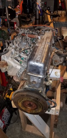 So I started looking into the L28 I got. It's a 42/n47 engine. I think that cooresponds to a 79-80zx. Anyway as with any engine, one of the first things I figure to check is compression. (Do you like my engine stand? This is temporary, I couldn't rotate it on the real safe engine stand. ) I put a pair of bolts in the flexplate and then bolted in the starter with a pair of 14mm m8 bolts. I pulled the plugs and though it's an older engine, the plugs are bosch platinum and look almost new, so I figure someone was working on the engine before the donor was junked. I put on the compression gauge and pulled compression readings first dry then with ~ a capfull of oil in each cylinder starting from #6 the closest to the flywheel. I used a jump box and a wire to the starter. it turned evenly and at a good speed. Cyl/Dry PSI/WetPSI #6, 90, 170 #5, 100,150 #4, 105, 170 #3, 105, 155 #2, 105, 180 #1, 35, 70 !!! Well crap. I was pretty happy till I hit cylinder 1. Yeah 90 on #6 wasn't so good, but it came right up with oil, so it's okay. #1 though dang 70 at the most. I'm reading that as probably a head/valve issue since the compression did come up a bit. it sucks though, it means I get to tear into the engine. I just bought rings and a seal kit so it'll all go in. I'm going to pull the cover and check the rocker gaps for #1 and see if maybe they're just too tight, but I bet something got burnt or something. If adjusting the valve clearance doesn't fix it, I'll pull the head and see what's what. I doubt there's a cracked cylinder, I'd really suspect a valve. Maybe a broken ring, but you'd figure the oil would not have made as much difference. Yay Rebuild fun. I did find that the 2+0 flywheel and the 2+2 flywheels are different, I've ordered a 2+2 flywheel to match the 2+2 pressure plate and clutch disk I bought. Larger clutch should last longer. Cheaper parts too. Sooo Anyone got any ideas before I tear into this engine? parts should be here Friday... Phar